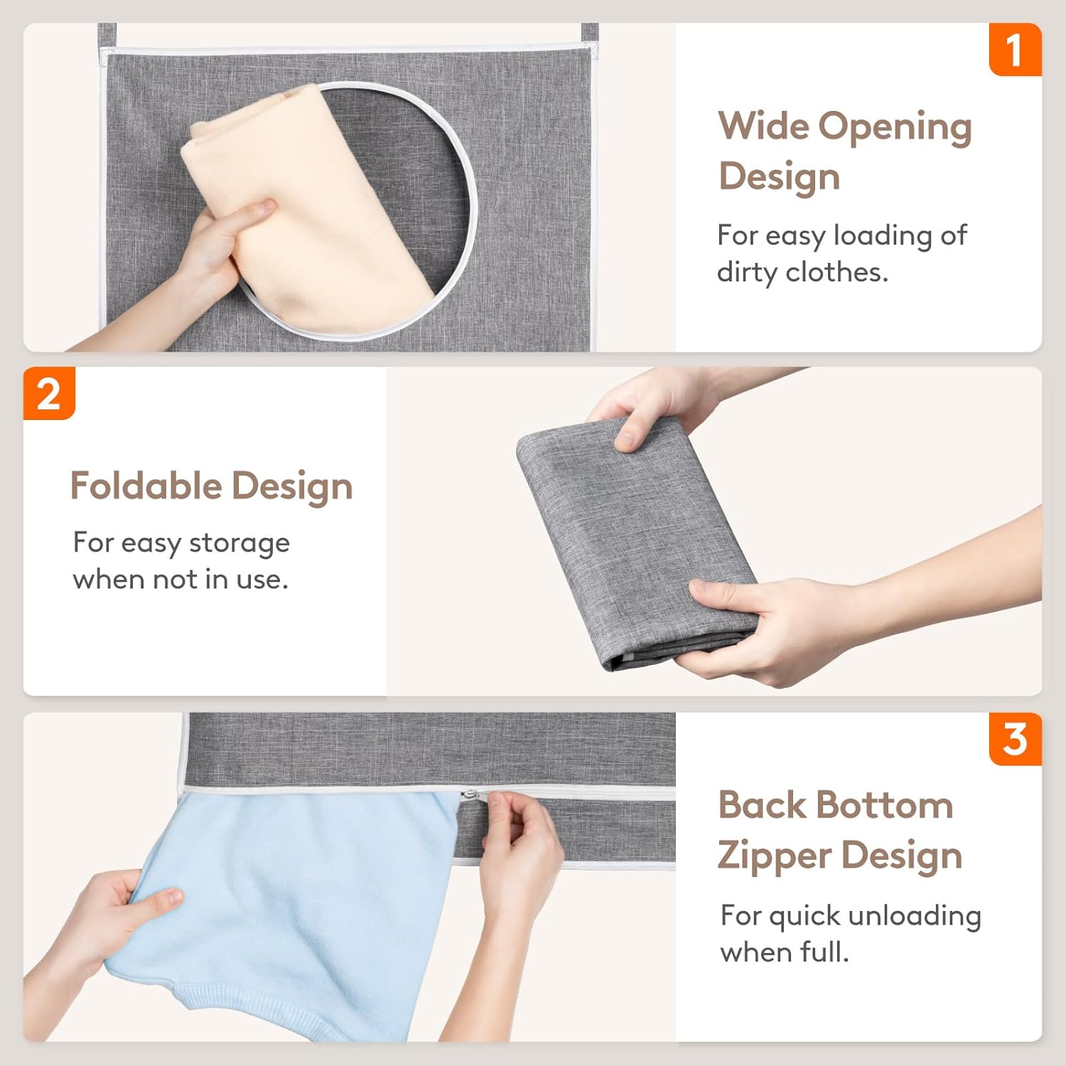 - Easy to Use: The over the door hamper for bathroom features a wide opening design for easy loading of dirty clothes and a smooth zipper at the back bottom for quick unloading when full. Folds up for storage when not in use.