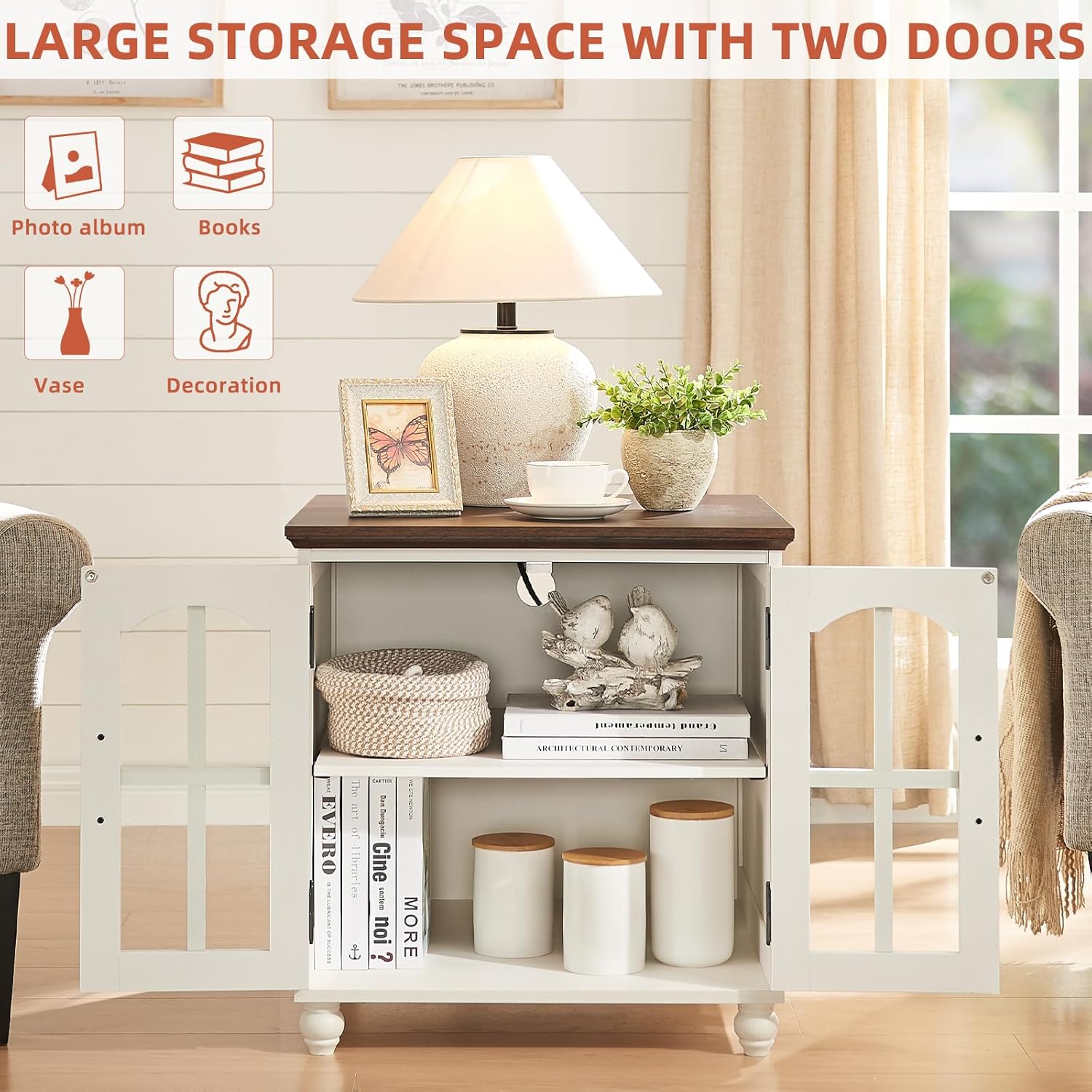 Farmhouse 24" End Table Set of 2 with Charging Station, Large Sofa Side Table with Glass Barn Door,Wood Night Stand with Adjustable Storage Shelf,Square Bedside Table for Living Room,Bedroom