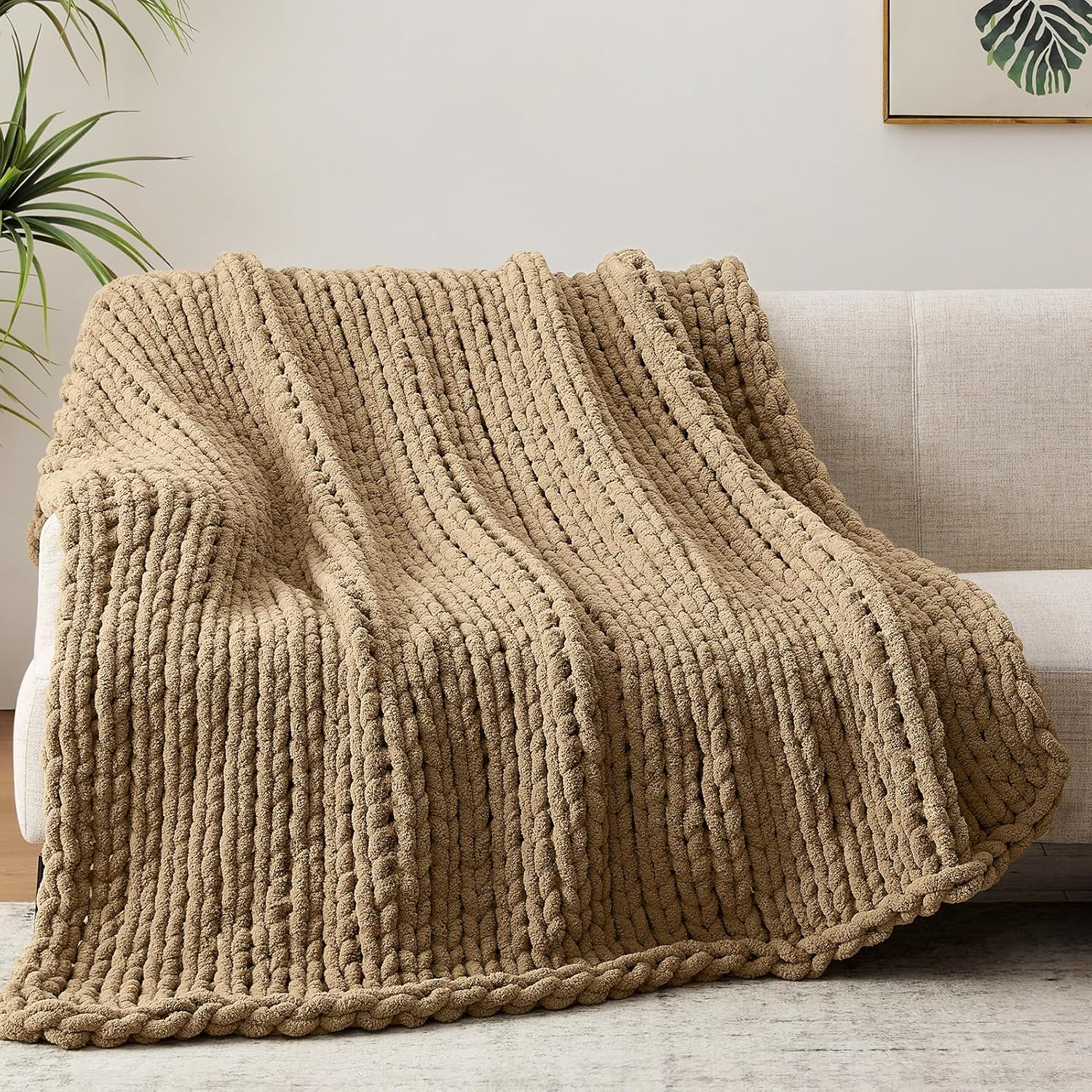 Chunky Knit Throw Blanket, 30''*40'' Knitted Throw Chenille Yarn for Bed Couch, Handmade Light Brown Crochet Big Thick Blanket, Machine Washable Cute Comfy Blanket for Home Decor