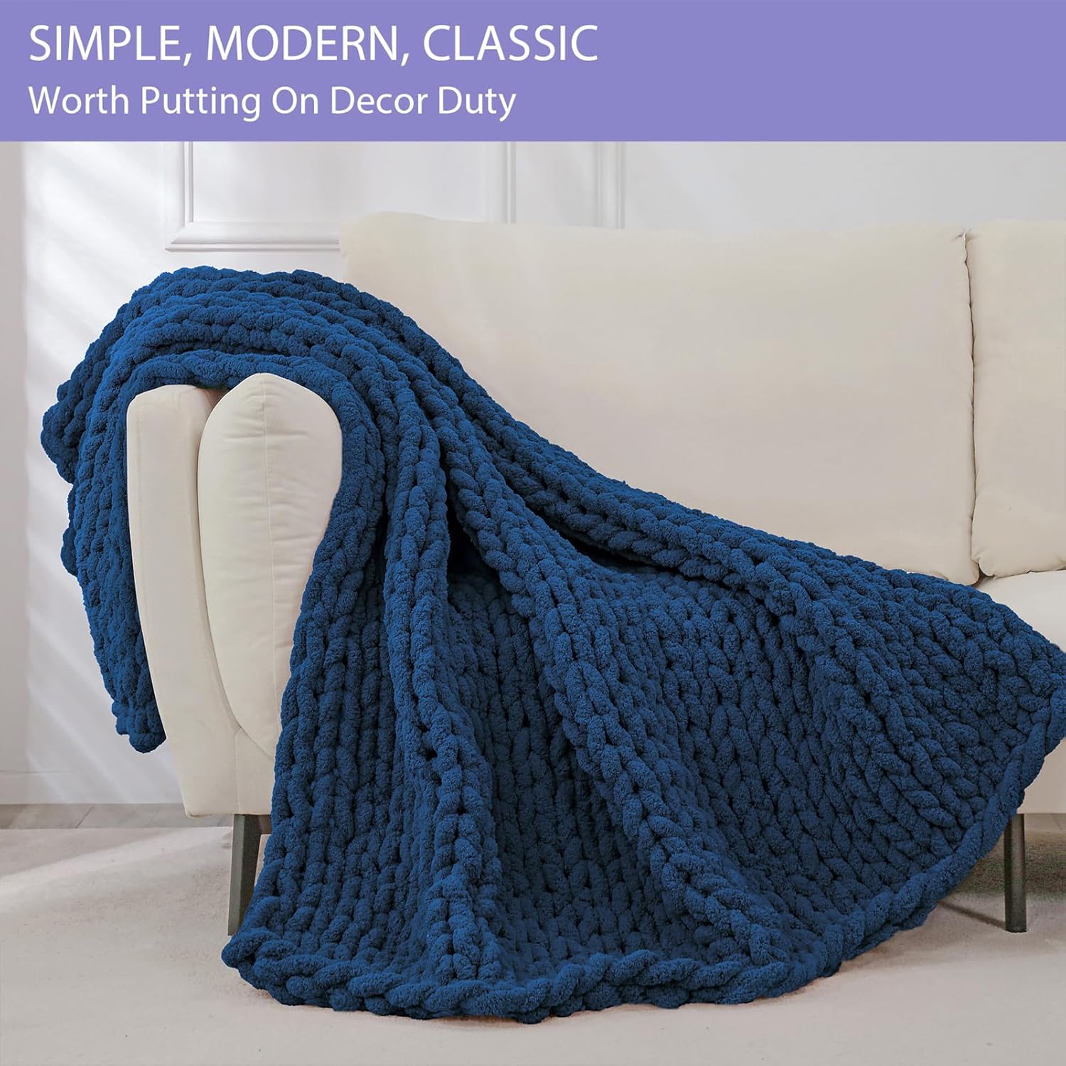 Bigacogo Chunky Knit Throw Blanket for Couch, 60x80 inches, 100% Hand Knitted with Thick Jumbo Chenille Yarn, Cozy Soft Large Rope Knot Cable Crochet Blankets for Sofa Bed Living Room, Navy Blue