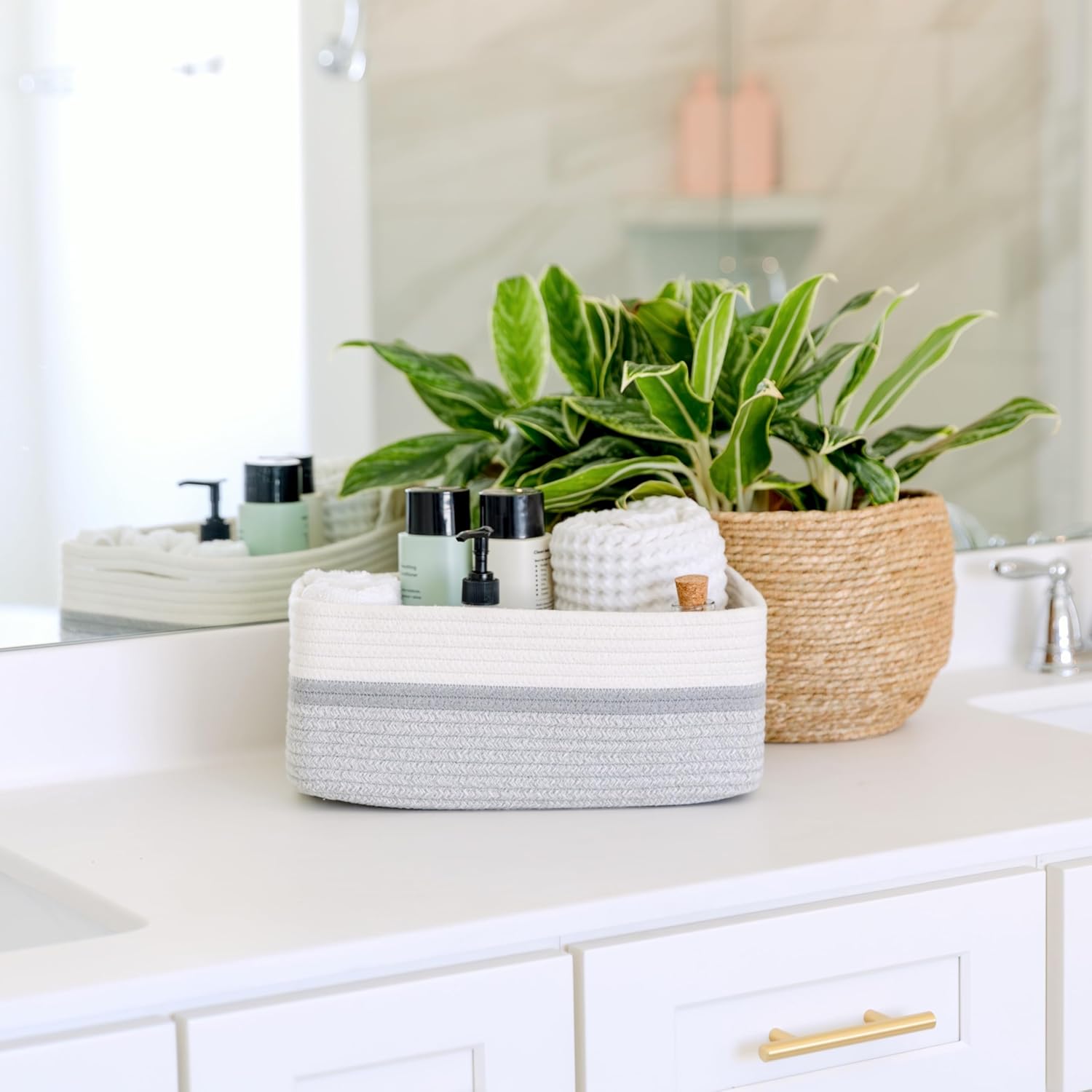 - Safe, Natural Cotton Organizer Bins: Crafted from the highest quality material in the market, our storage bins are oh-so-sturdy (and cute) and ready to take on little humans. They’re 100% safe, so you can rest easy if teething toddlers take a nibble. Reinforced Hidden Handles: Now you see ‘em, now you don’t! With completely hidden handles that blend seamlessly into the rope basket, you’ll be the Houdini of home organizing. They’re even double-stitched and reinforced for extra heavy loads!