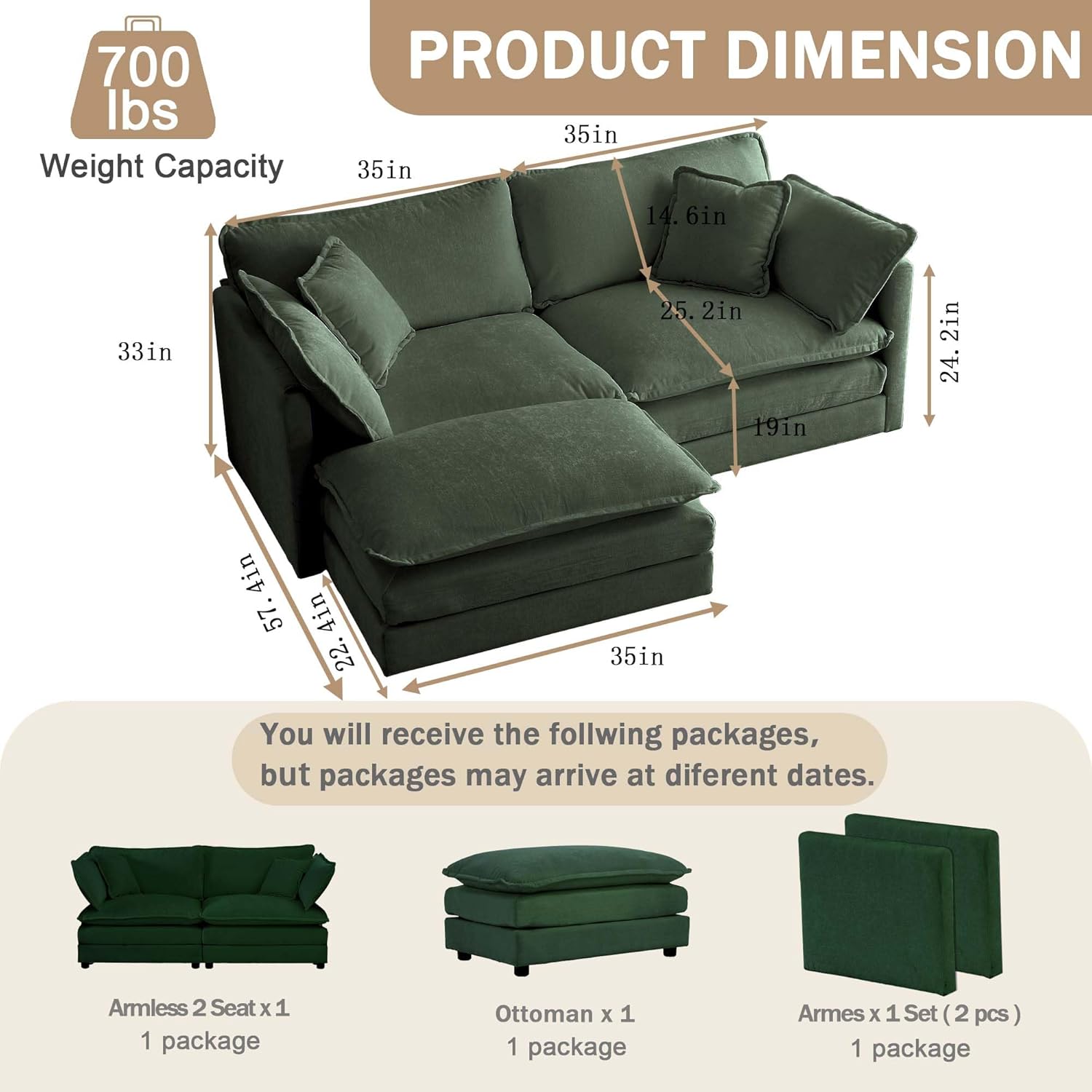 Sectional Sofa 2 Seater with Movable 1 Ottoman,Oversized Modular Couch Deep Seat (Green, 76.7 inch-L)