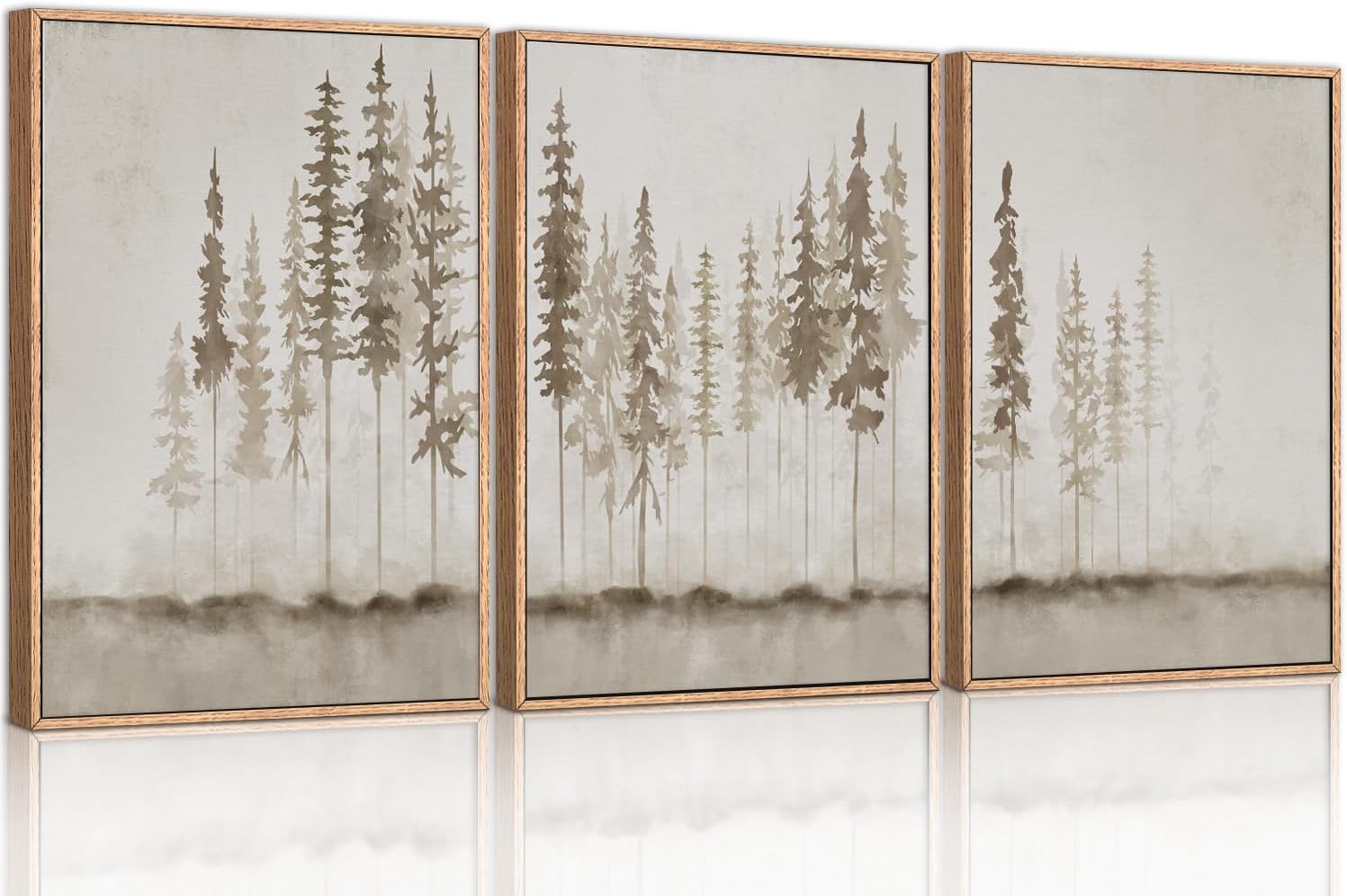 HPINUB Misty Forest Framed Canvas Wall Art Set, Foggy Pine Tree Wall Decor, Pastel Nature Landscape Wall Painting, Evergreen Coniferous Plant Art Print for Living Room, Bedroom, Office-24 x36 x3