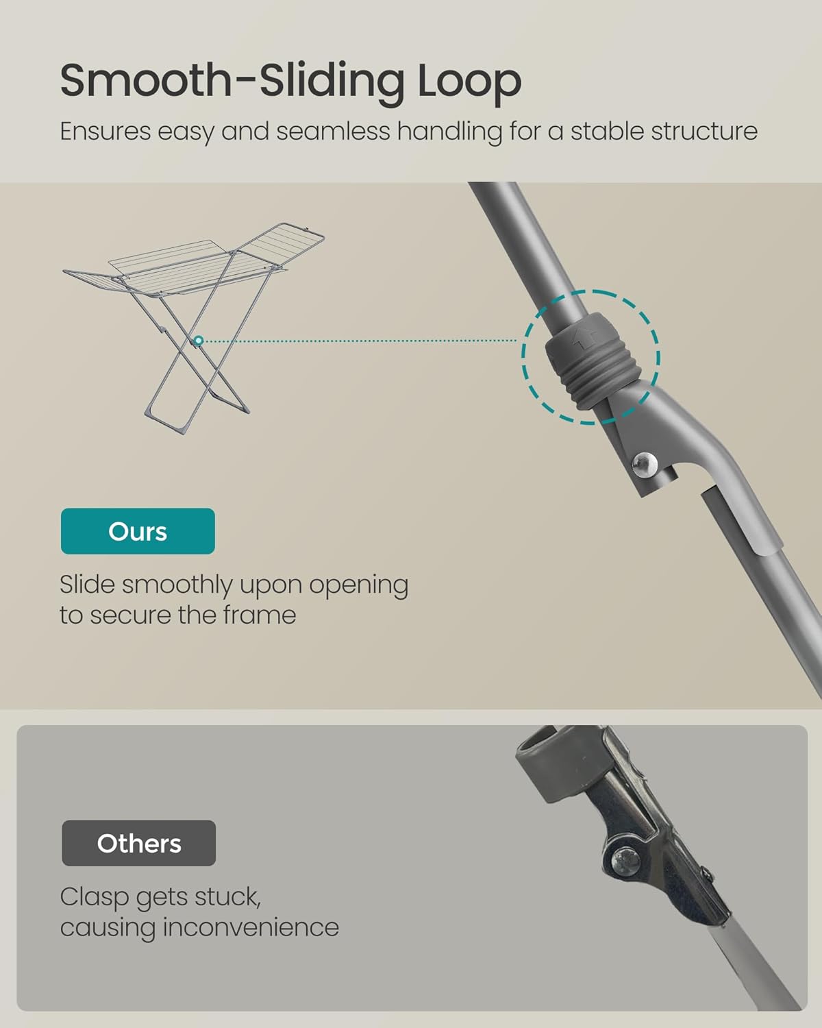 - [Thoughtful Details] This drying rack features a smooth-sliding loop, a plastic clip that keeps wings securely in place when folded, and floor-friendly plastic feet