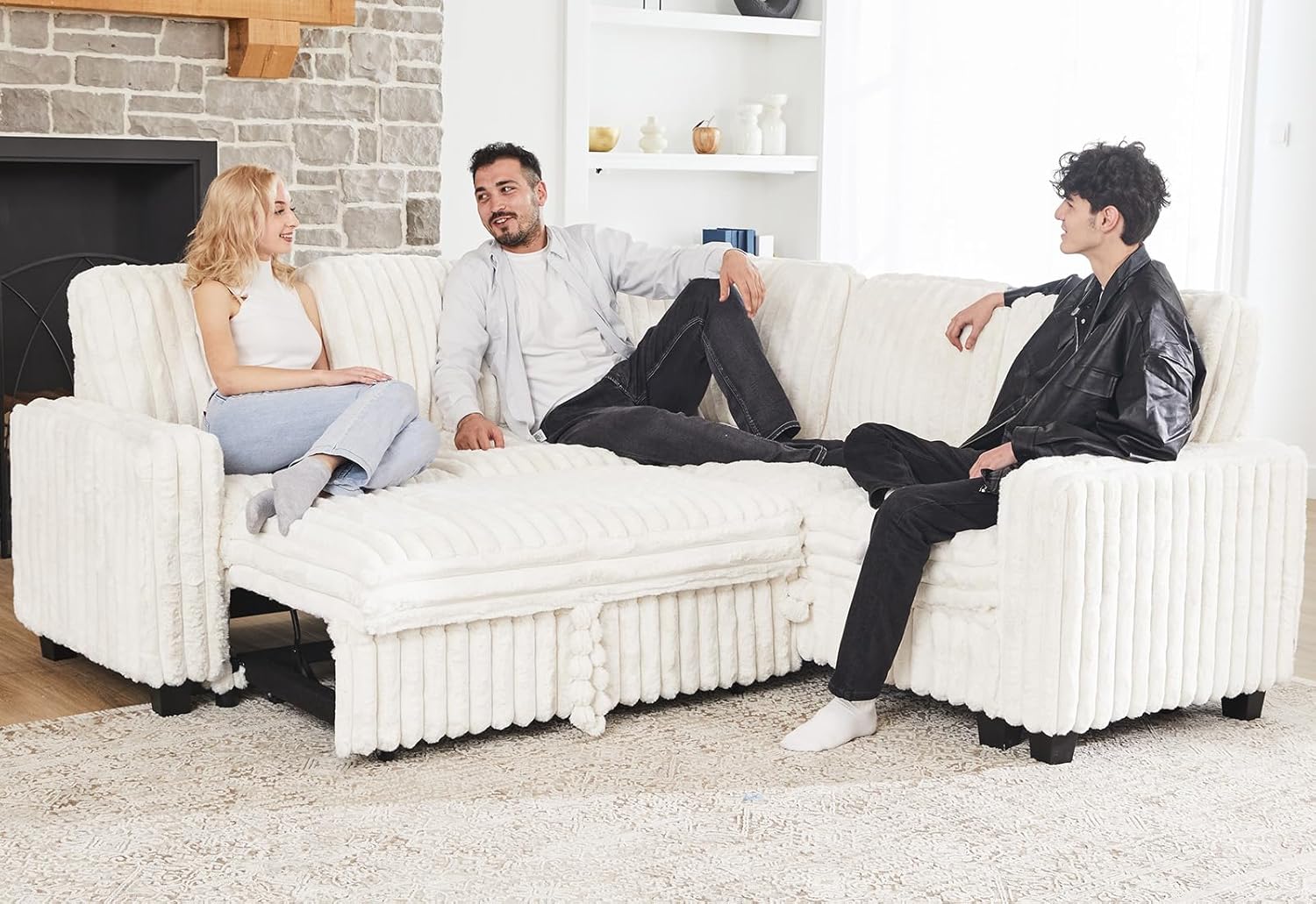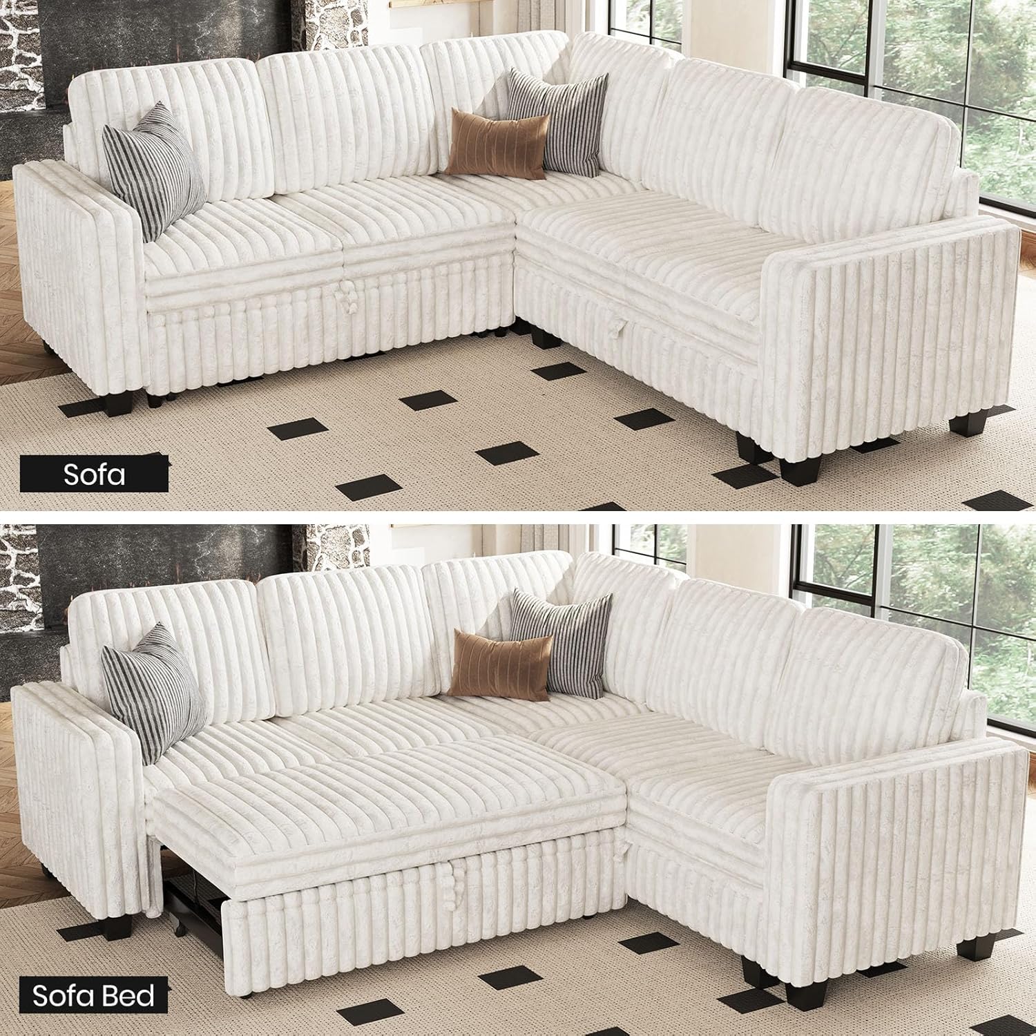 Belffin Plush Corduroy Modular Sectional Sofa with Pull Out Bed Convertible Small Sectional Corner Couch for Living Room White Couch
