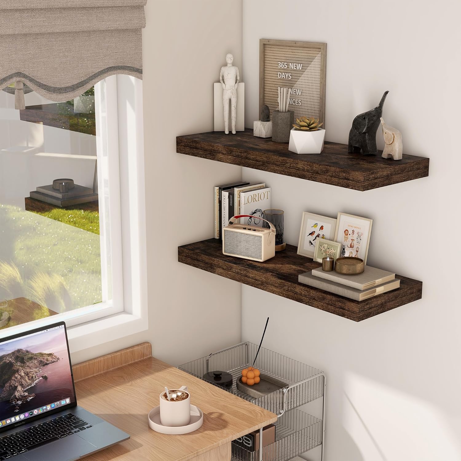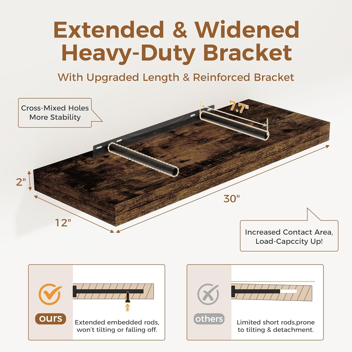 30 Inch Floating Shelves, 12 Inch Deep Floating Shelf for Wall, Rustic Deep Shelves for Books, Bathroom, Living Room, Kitchen, 30 x 12 x 2 Wood Floating Shelves, Rustic Brown Color, Set of 2