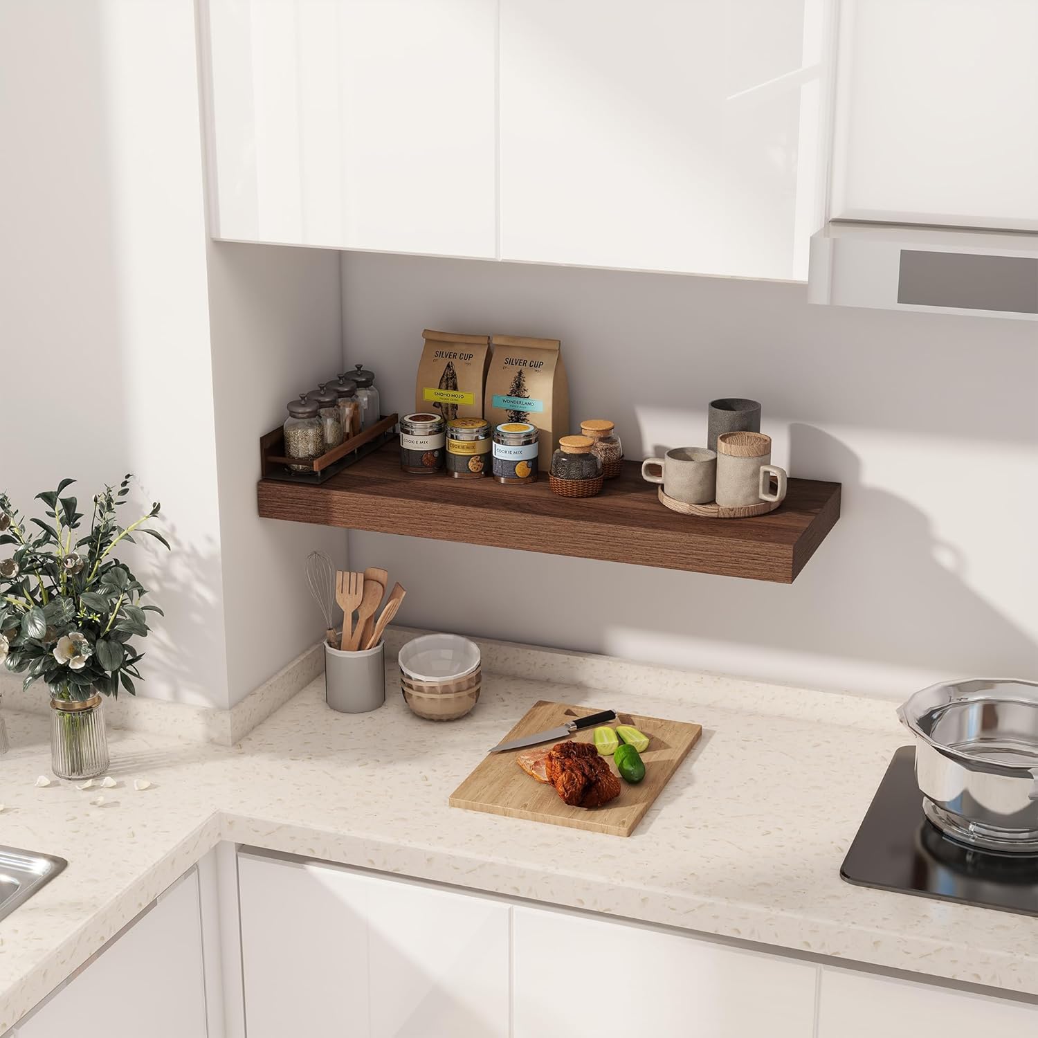 - ăFARMHOUSE RUSTIC WALL SHELFăThese floating shelves are made of premium engineered wood board and invisible one-piece bracket. The rustic wooden grain surface add character and warmth to any modern or traditional interior with these thick floating shelves, contrast shelves at staggering heights on the wall or mount side-by-side or in the corner for a clean streamlined look.