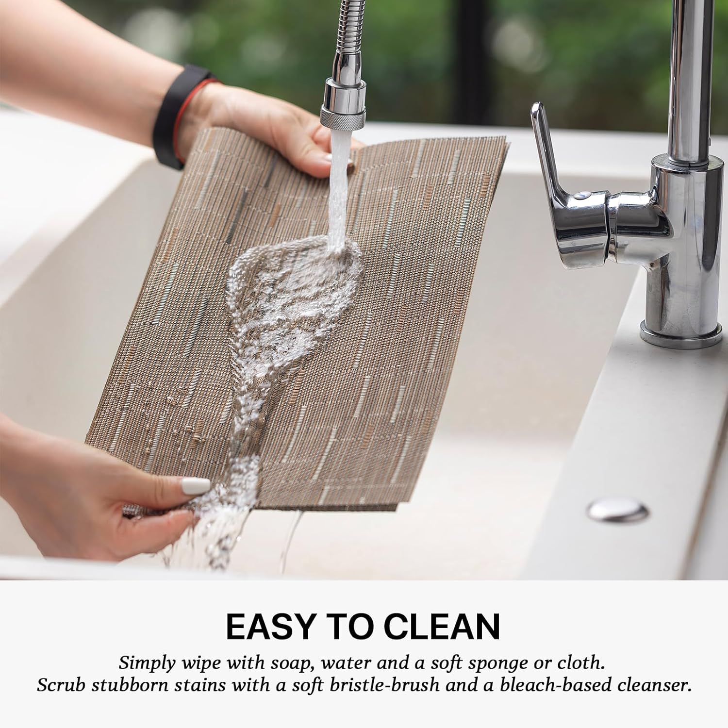 - EASY TO CLEAN:The washable placemats can be washed repeatedly.How to clean the place mats for kitchen table:Simply wipe with soap,water and a soft sponge or cloth.Scrub stubborn stains with a soft bristle-brush and a bleach-based cleanse.