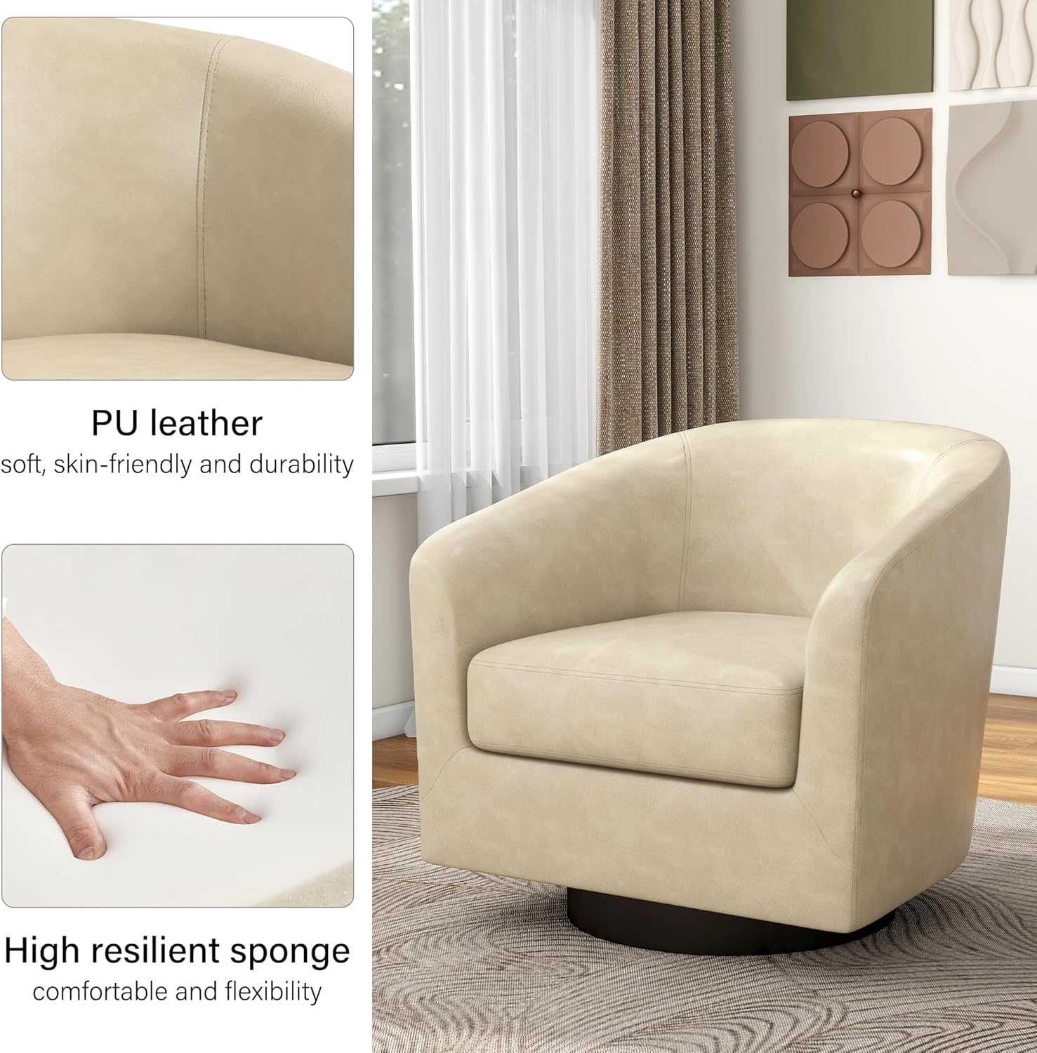 Swivel Barrel Accent Chair, Modern Round Faux Leather Arm Chair for Living Room, Bedroom, Comfy Club Reading Chairs for Adults(Faux Leather, Cream, Set of 4)