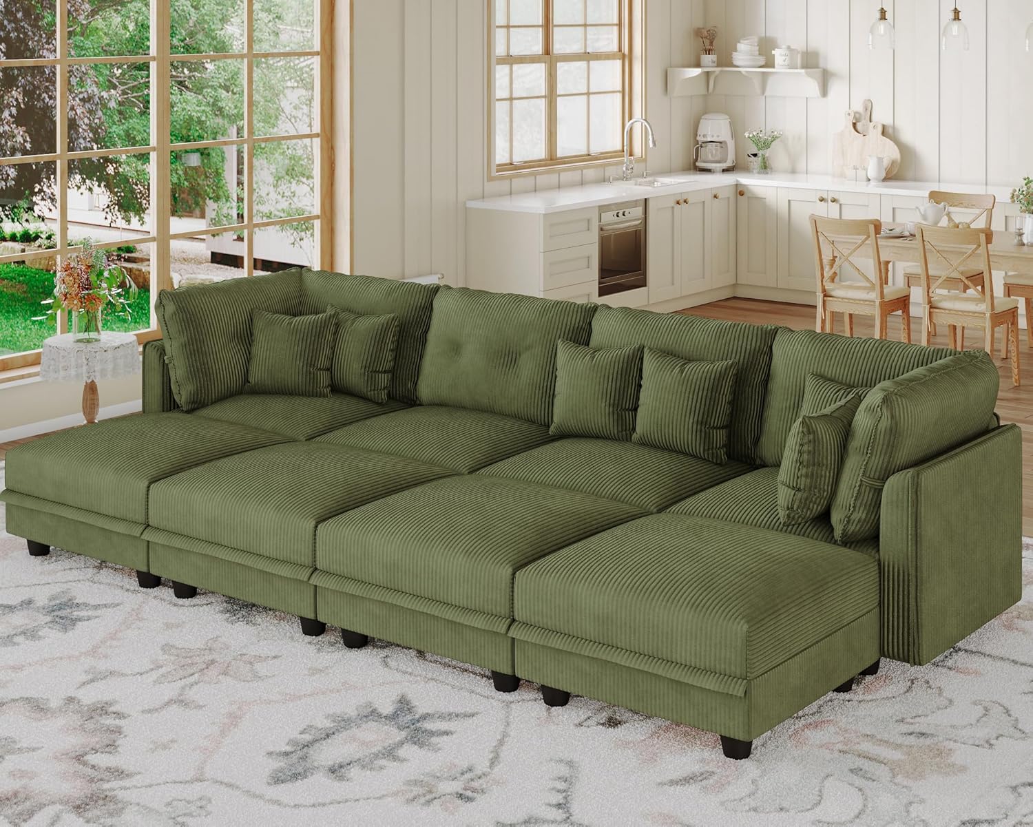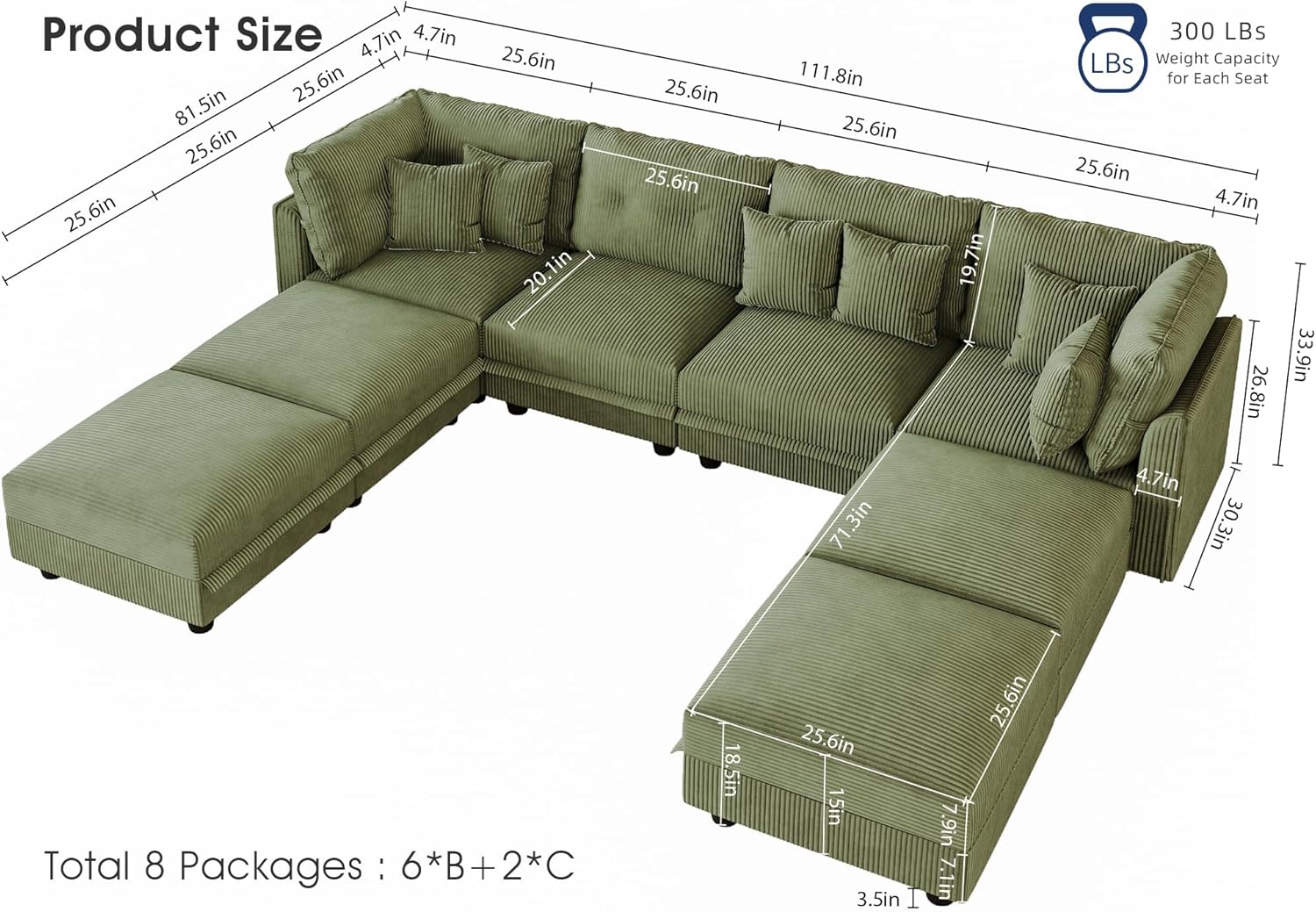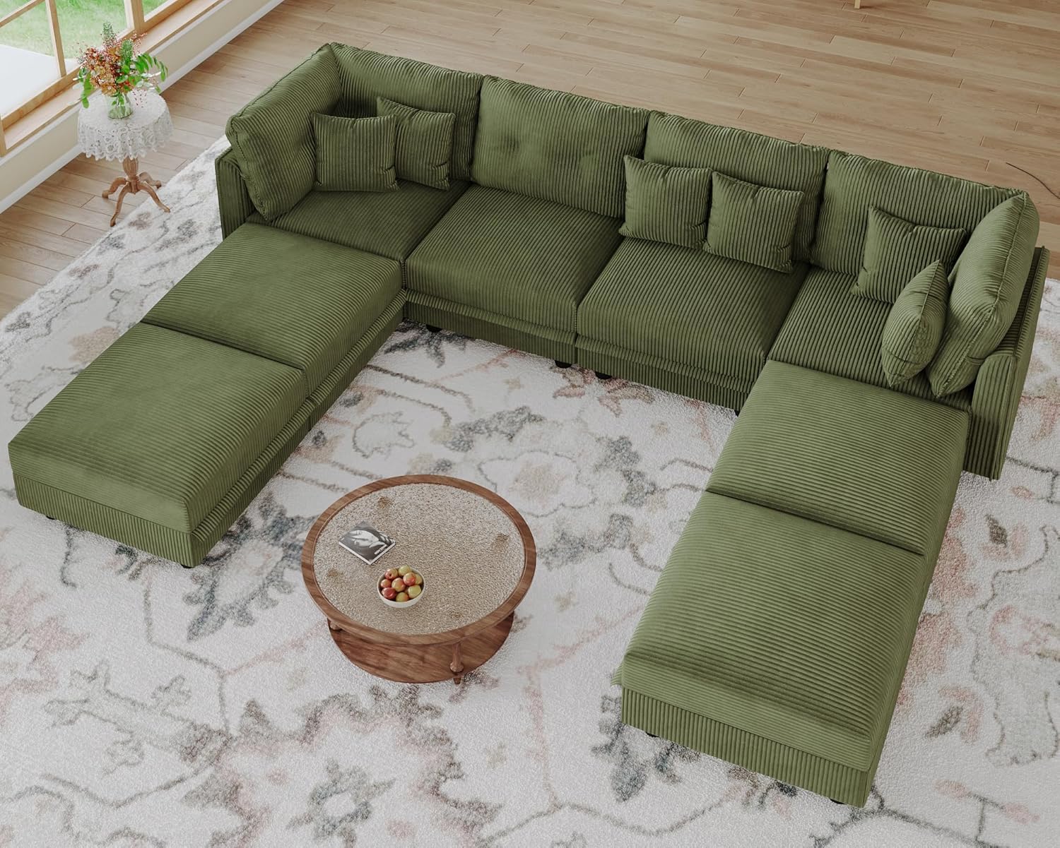 LLappuil Modular Sectional Sofa with Storage Seats, Corduroy Convertible Modular U Shaped Sectional Couch for Living Room, 8 Seat Oversized Sofa with 6 Back Cushion 6 Throw Pillow, Green