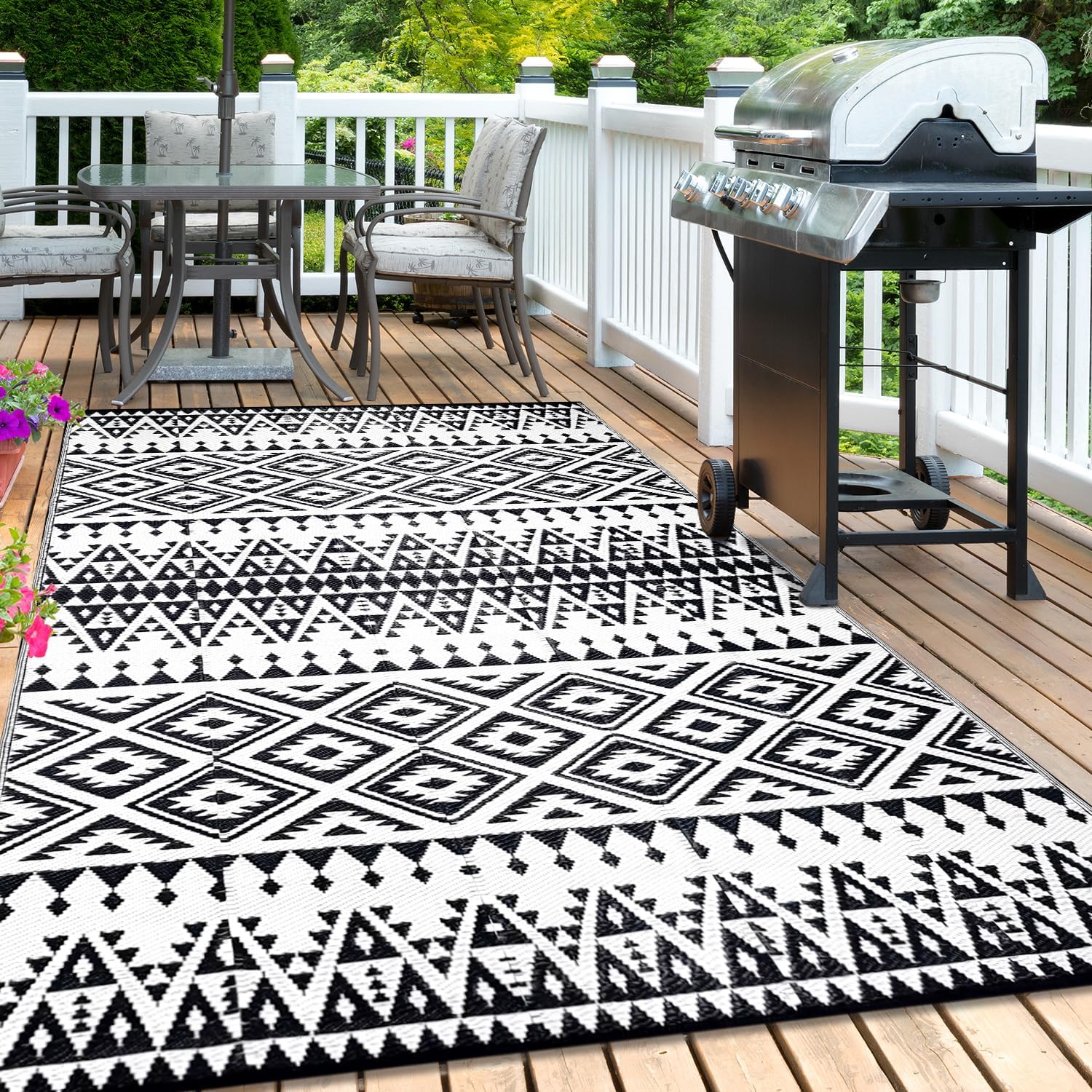 Waterproof Outdoor Rug 6x9ft, Bohemia Reversible Plastic Straw Mat for Patio RV Deck Porch Backyard Balcony Camping Picnic Beach Indoor Outdoor Carpet, Black&White