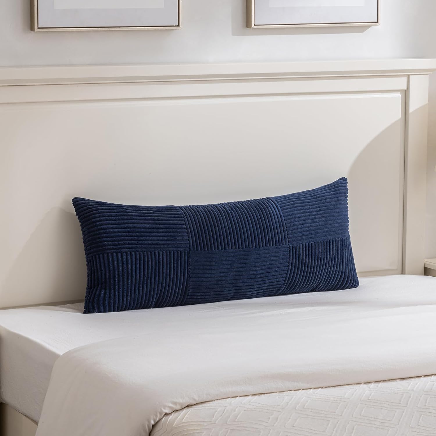 Fancy Homi Set of 2 Navy Blue Boho Long Lumbar Body Decorative Throw Pillow Cover 14x36 Inch for Bed Couch Bedroom Bench, Soft Patchwork Corduroy Textured Pillow Case, Rustic Farmhouse Room Décor