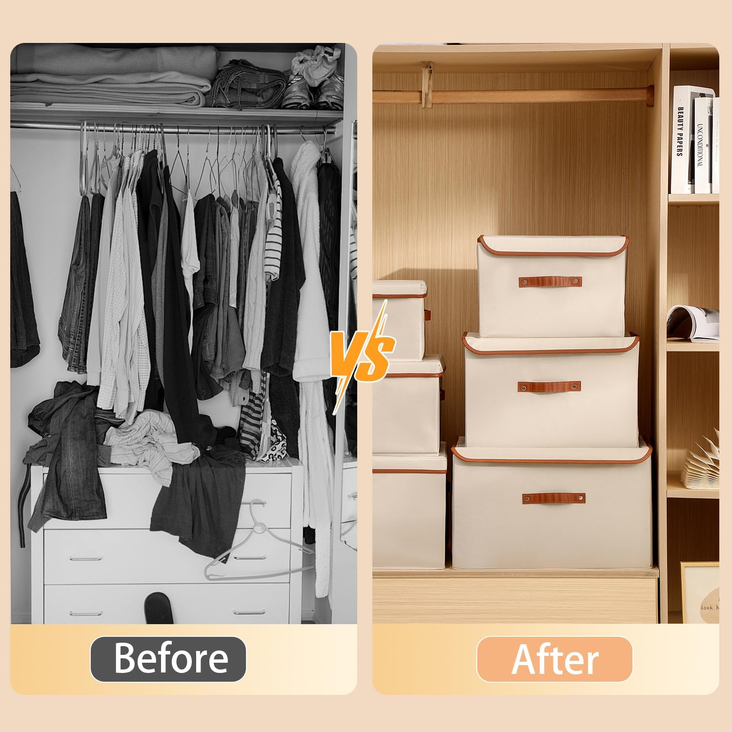Tuza 4 Pack Large Fabric Storage Bins with Lids, Foldable Storage Boxes with Lids for Organizing, Decorative Storage Boxes with Handles for Home, Bedroom, Closet, Office(Khaki, Medium)