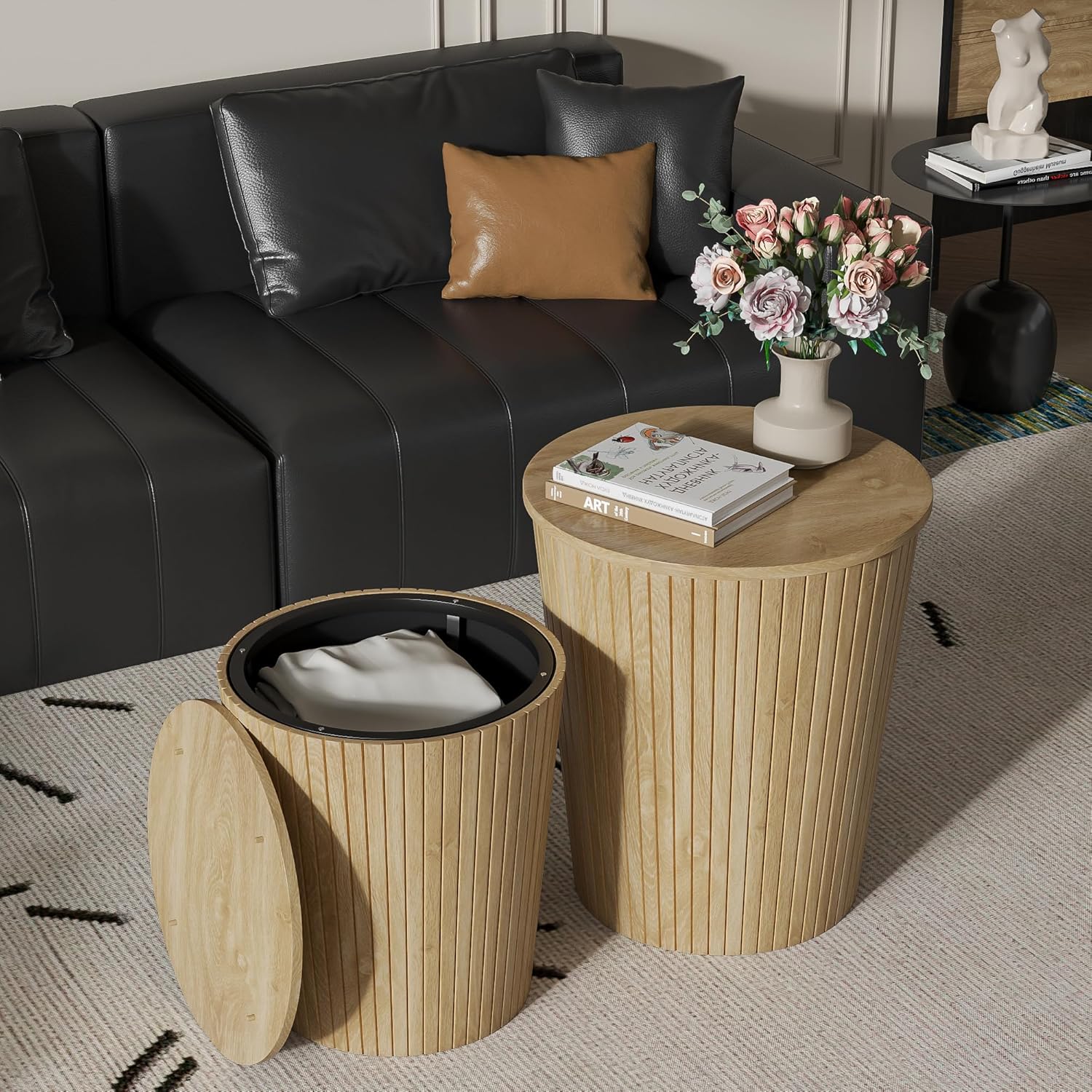 - [Round coffee table with storage]: The round side table comes with storage space to store your belongings, solving the problem of clutter in your living space with an accessory that can not only hold your cushions, blankets, pillows and books, but also tie your interior decoration together with a unique and cohesive look