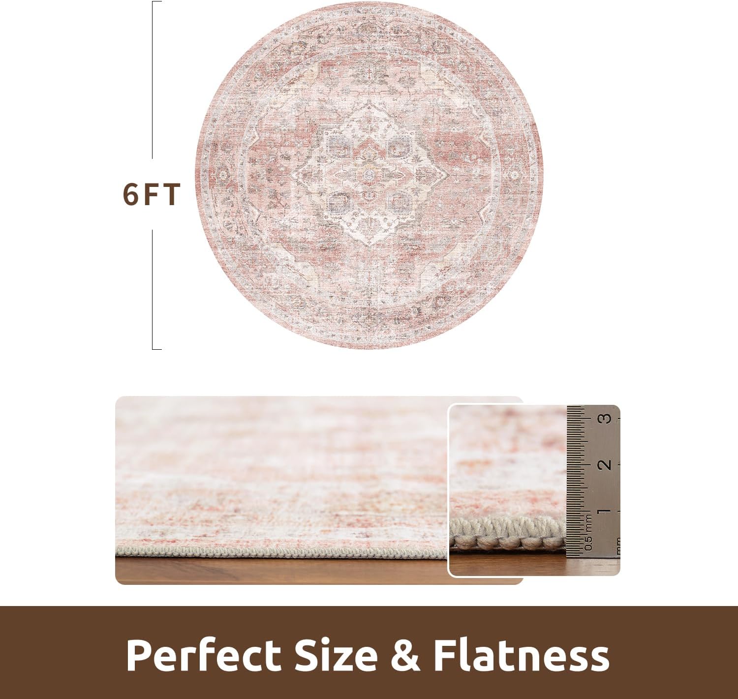 AMOAMI 6FT Round Vintage Soft Pink Rug - Non Slip Circle Machine Washable Rug for Living Room, Bedroom, Office Under Table