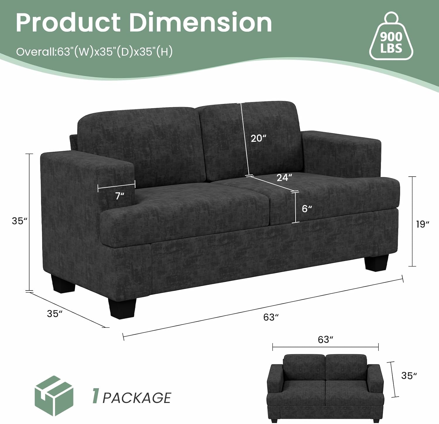 Sofa, 63” Comfy Loveseat Sofa with Deep Seats, Couch for Living Room, Modern Sleeper Couch, Dark Grey Chenille