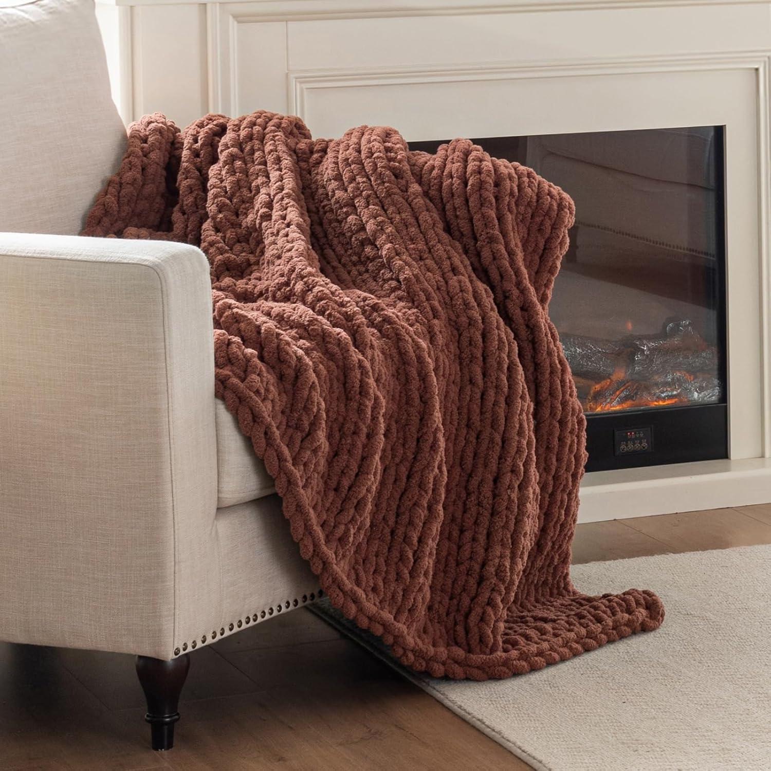 Chunky Knit Blanket Throw, 100% Hand Knit Throw Blanket Handmade Chenille Cable Knit Throw for Couch, Stylish Cozy Soft Rope Knot Crochet Blanket for Home Decor, Copper Brown, 40x50 Inches