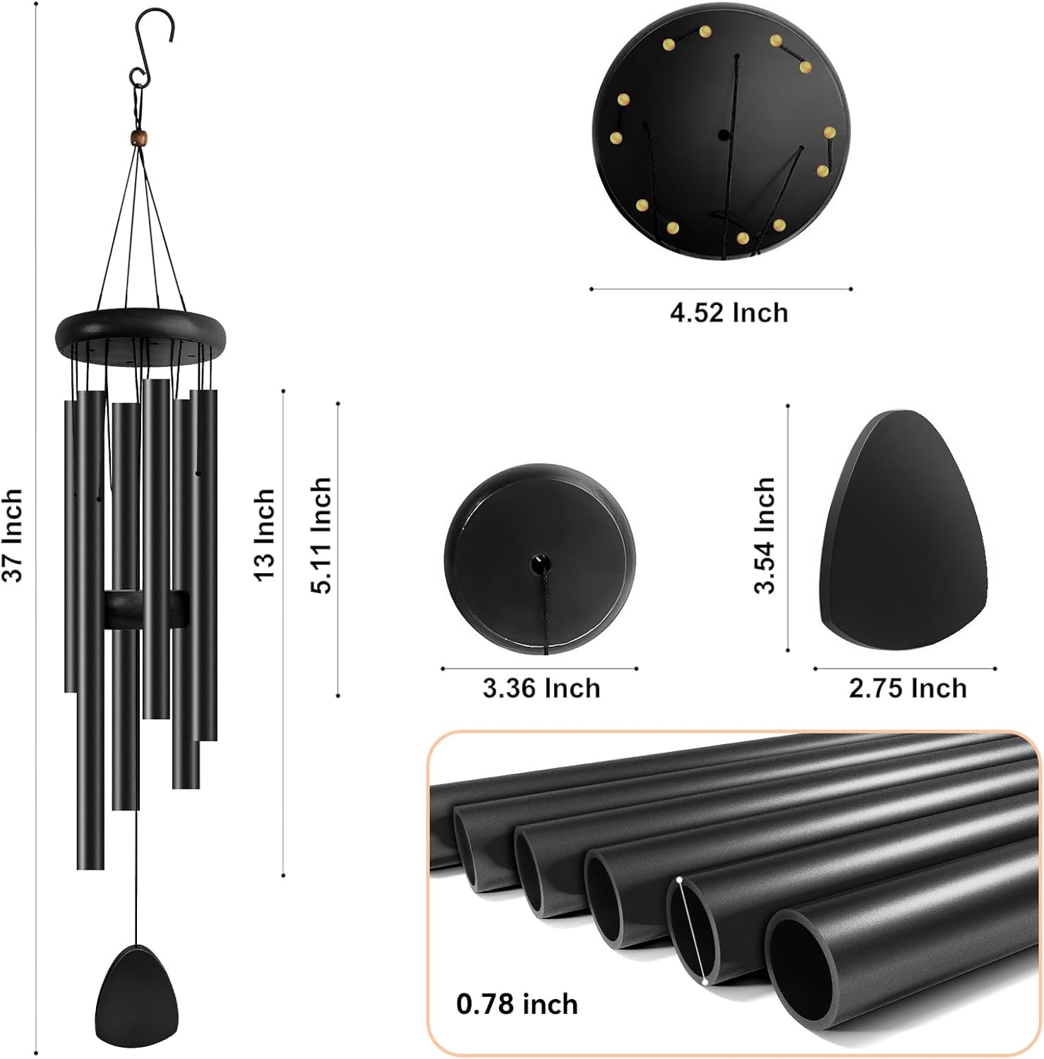 - ♪【Bigger and Better】The wind chime is made of aluminum pipe and pine. The total length of the wind chime from the top's S-shaped hook to the bottom's catcher is 37" Among them, six classic black anodized aluminum tubes have excellent corrosion resistance and wear resistance, and the length ranges from 8.7" to 12.6". The wood is made of wear-resistant and non-cracking pine. The adjustable wooden striker allows you to adjust your favorite position at will.