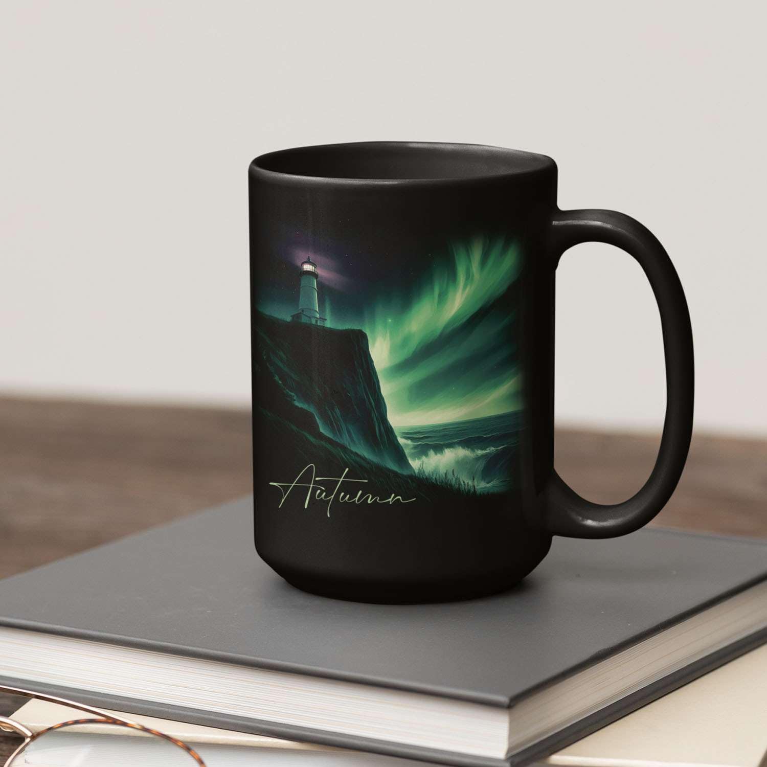 Customized Name Black Coffee Mug, Personalized Beautiful Northern Lights And Lighthouse Mug, Custom Mystical Ocean View Ceramic Cup, Gift For Women Men, Nature Themed Mug 11oz 15oz