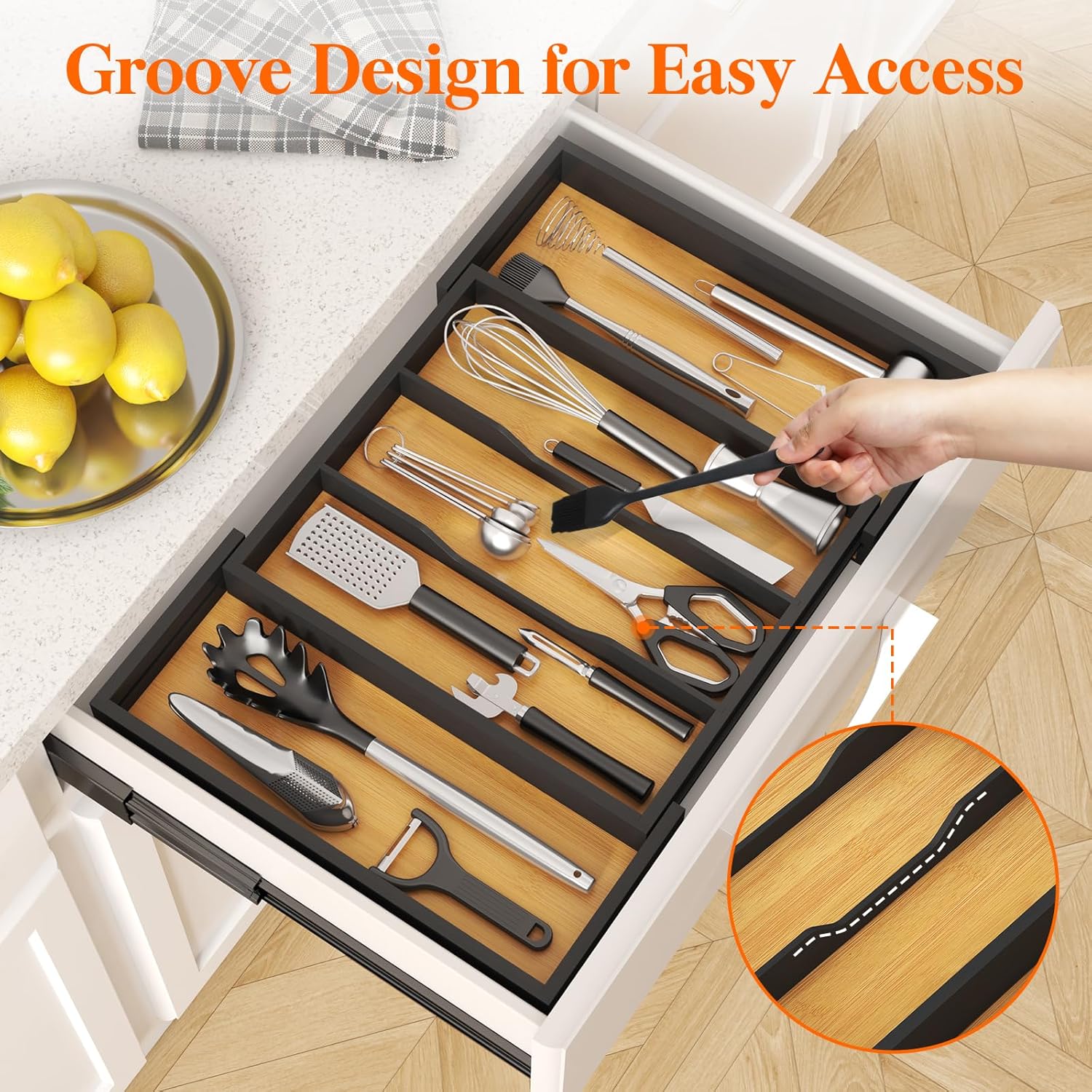 Lifewit Utensil Organizer for Kitchen Drawer, Bamboo Cooking Utensil Tray, Expandable Cutlery Silverware Flatware Holder, Adjustable Spatula Tools Gadgets Storage Divider, Large, Natural and Black
