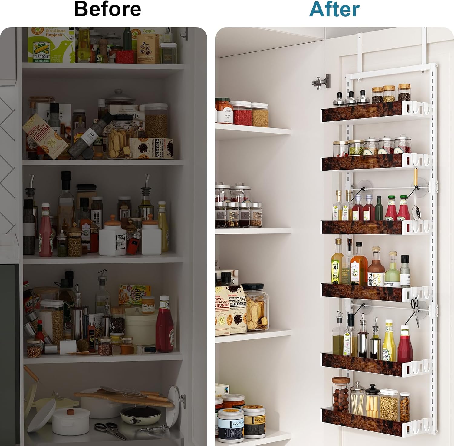- ćLarge Capacity and Stable Structureć6-layer large capacity can be reasonable partition to place your things.Strong load-bearing,long-lasting and durable.Over The Door Pantry Organizer is made of high quality metal materials,with enhanced load capacity,robustness,rust resistance and stability