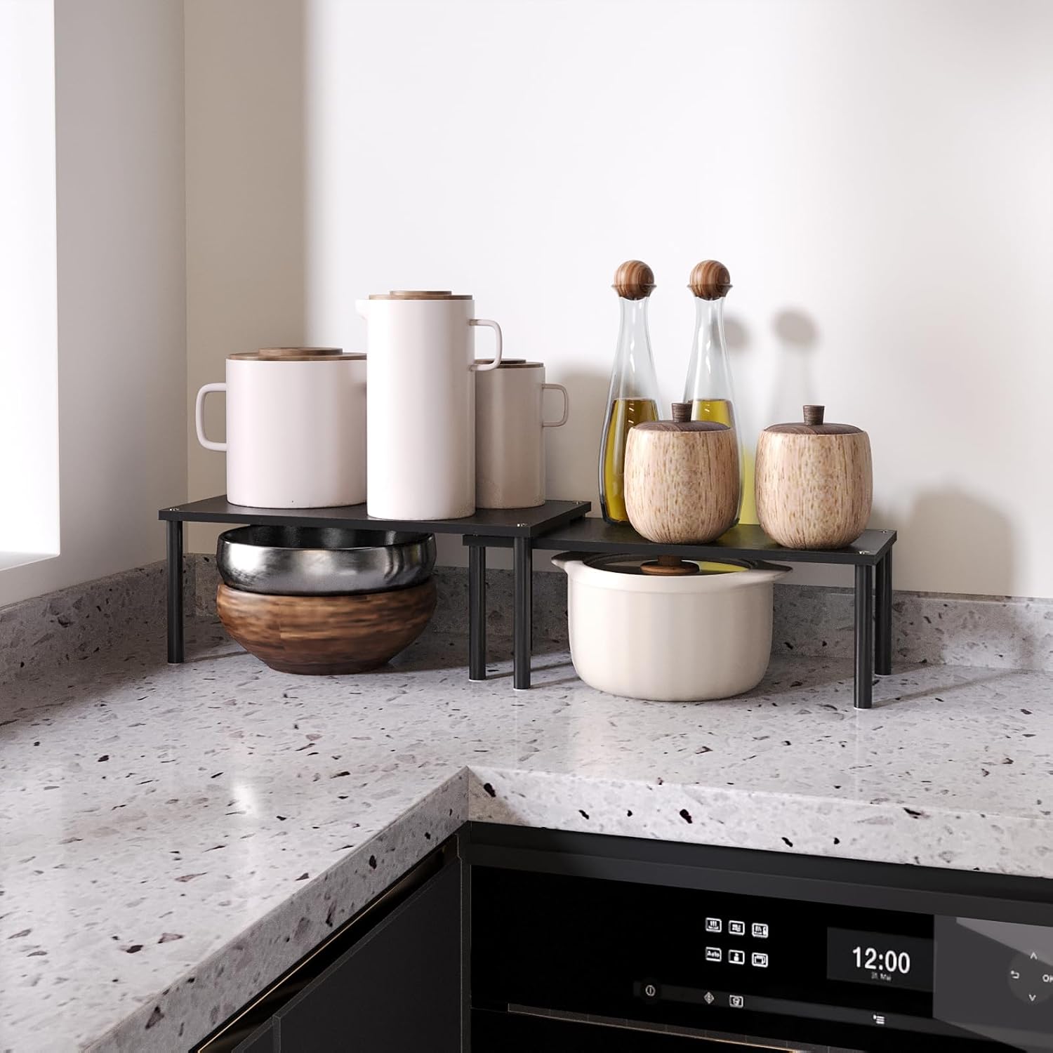 Cabinet Organizer Shelf(Set of 2),Kitchen Counter Shelves,Bamboo Spice Rack Countertop and Cabinet,Stackable Expandable,Large(Black)