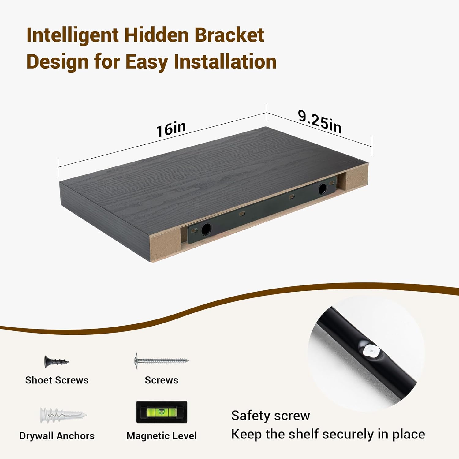 16 Inch Floating Shelves, 16"x9.25"x1.5" Inch Deep Floating Shelves for Wall, Wooden Shelves for Bathroom, Bedroom, Living Room, Black