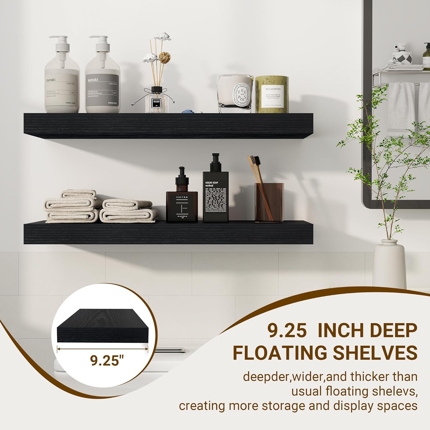 24 Inch Floating Shelves, 24"x9.25"x1.5" Inch Deep Floating Shelves for Wall, Wooden Shelves for Bathroom, Bedroom, Living Room, Black