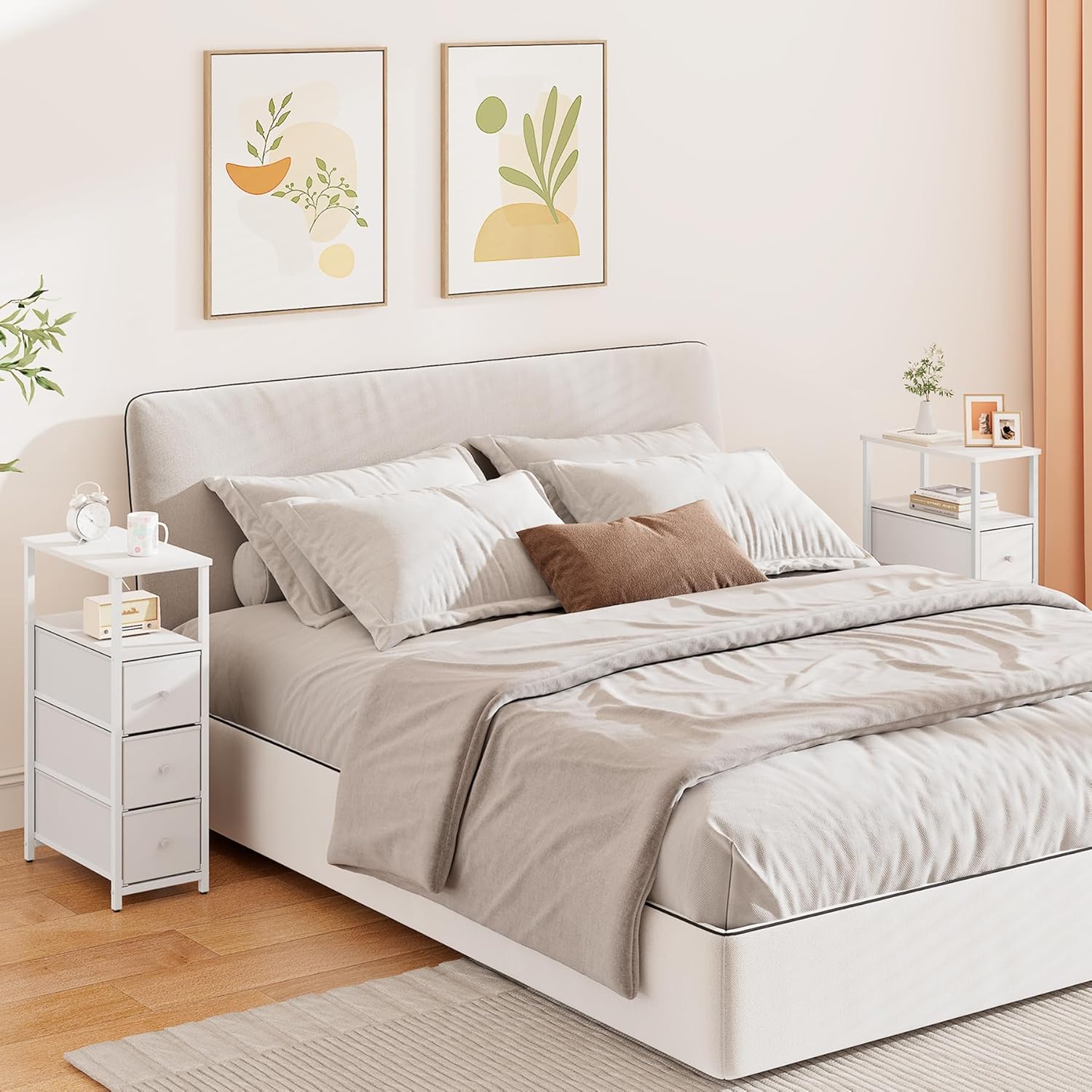 TUTOTAK Narrow Night Stand, Slim End Table, Tall Side Table with 3 Fabric Drawer, Small Bedside Table with Storage, Set of 2, for Living Room, Bedroom, White TB01BW072