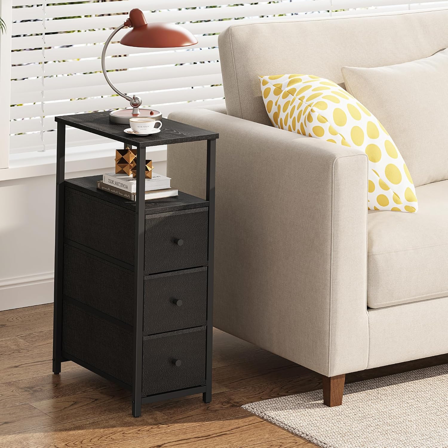 TUTOTAK Narrow Night Stand, Slim End Table, Tall Side Table with 3 Fabric Drawer, Small Bedside Table with Storage, Set of 2, for Living Room, Bedroom, Black TB01BK072