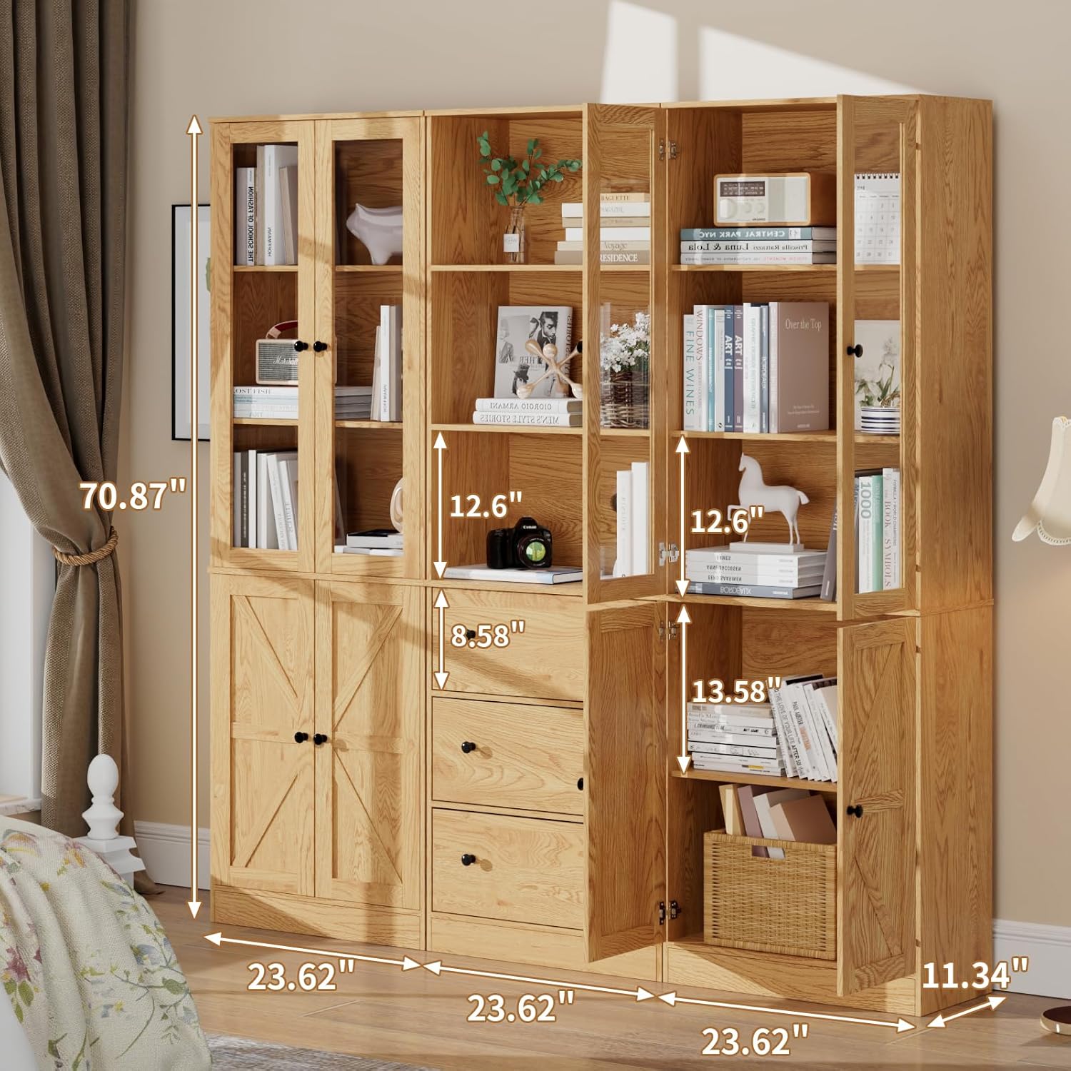 - 【71" Tall Bookcases Set of 3】- One bookcase with 3-tire open shelves and 3 drawers + two 5-tier bookcases with doors are made of 0.6” thickness high-quality particleboard, waterproof and scratch-resistant, they are reliable and sturdy large bookcases. Equipped with anti-tipping iron plate, the natural bookcases are more stable to use