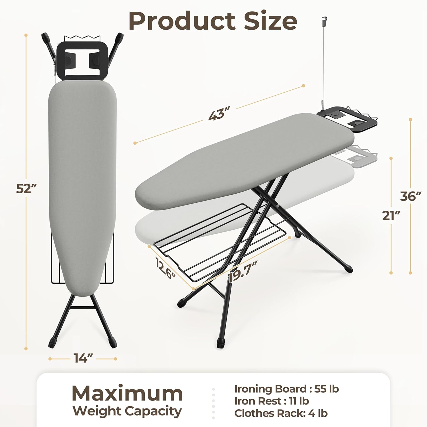 - Full-size Ironing Board: The iron stand provides ample space to meet all your ironing needs. The 43β³ LΓ 14β³ W surface ensures an efficient ironing and sewing experience and is ideal for larger garments