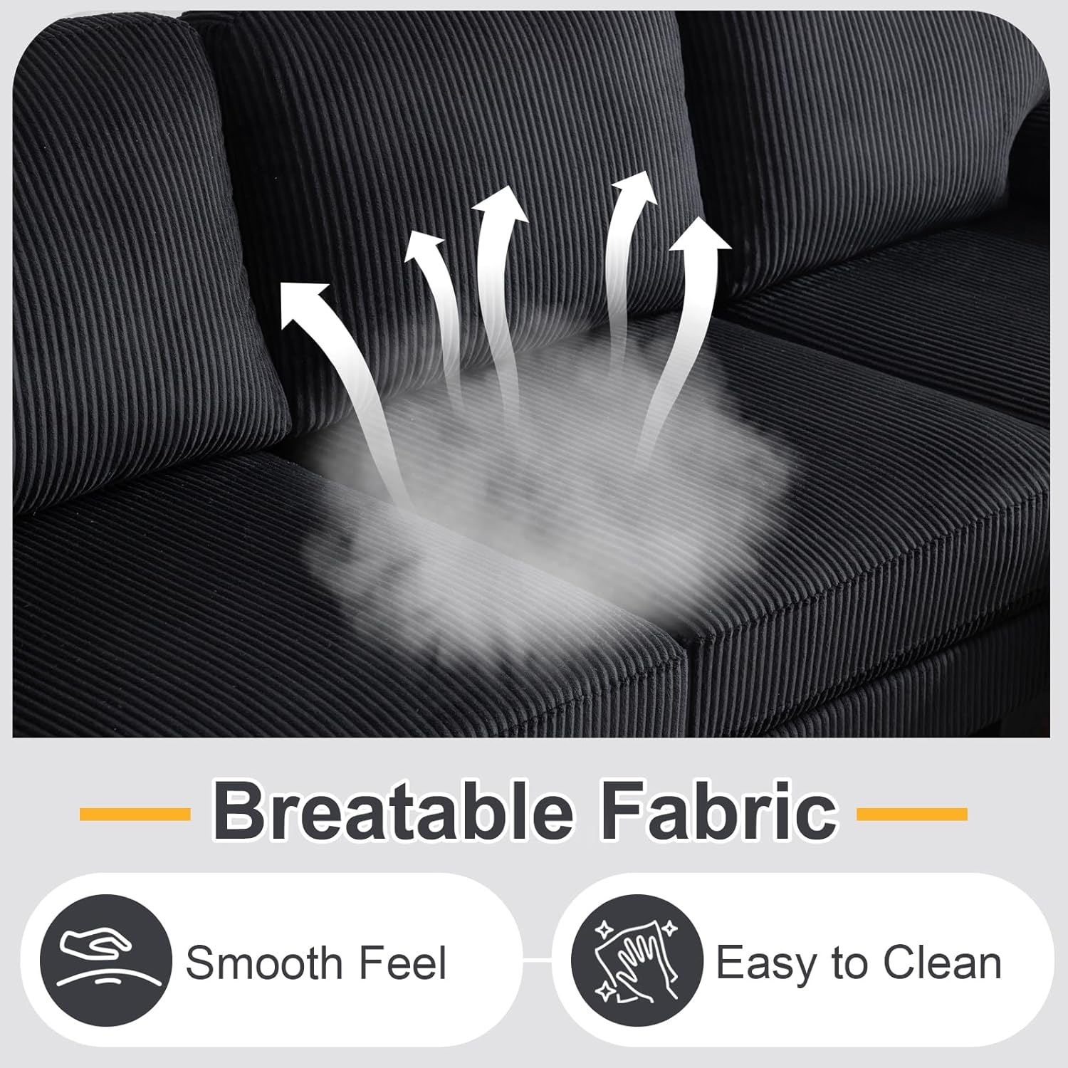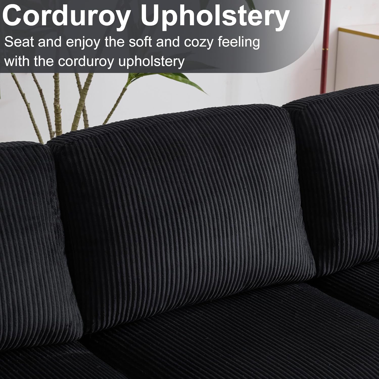 Karl home U-Shape Sectional Sofa Couch 111" Modern 4-Seat Sofa with Chaises Corduroy Fabric Upholstered Covertible Couch with Wood Grain Legs for Living Room, Reception Room, Apartment, Black