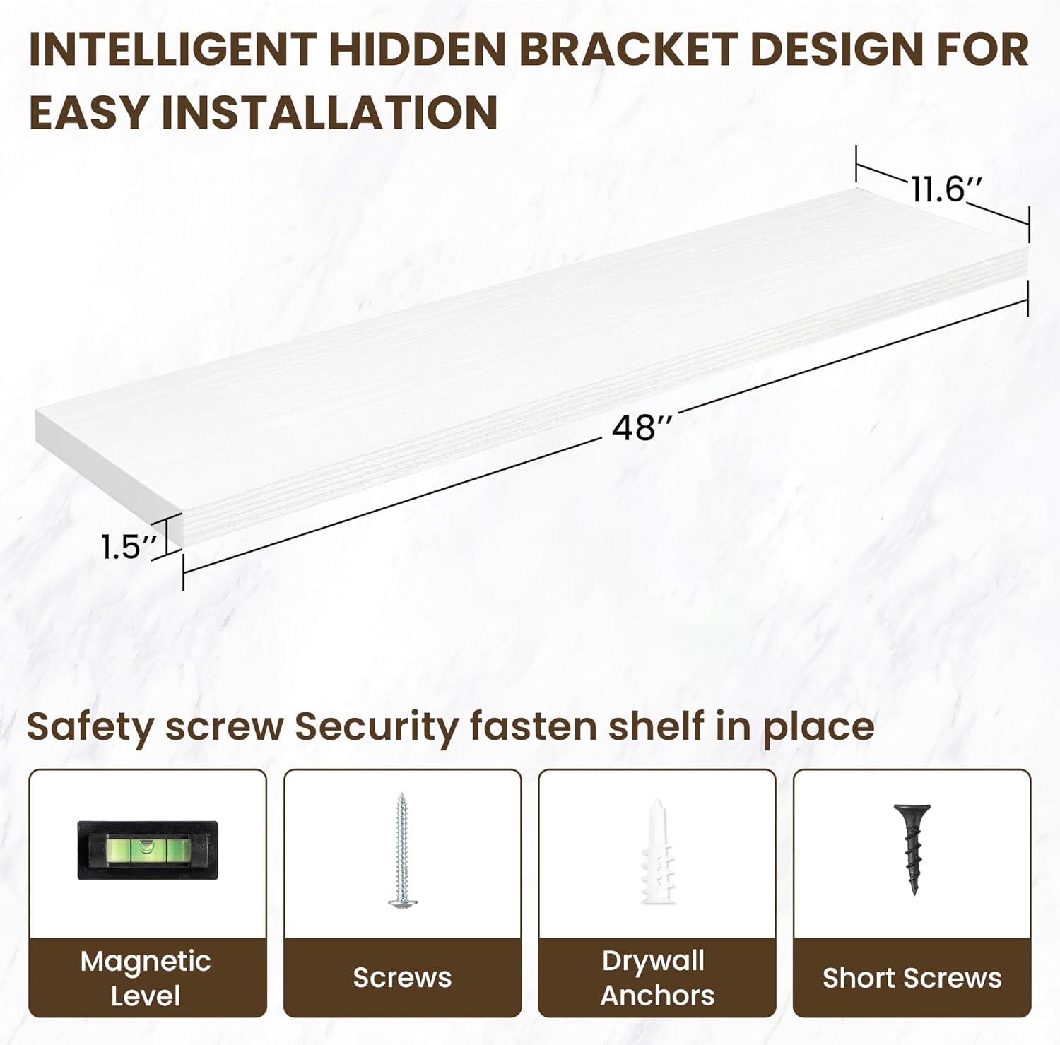 48 Inch Floating Shelves, 11.6 Inch Deep Floating Shelves for Wall, Floating Shelf with Invisible Brackets, Deep Shelves for Bathroom, Bedroom, Living Room, 1 Pack, White