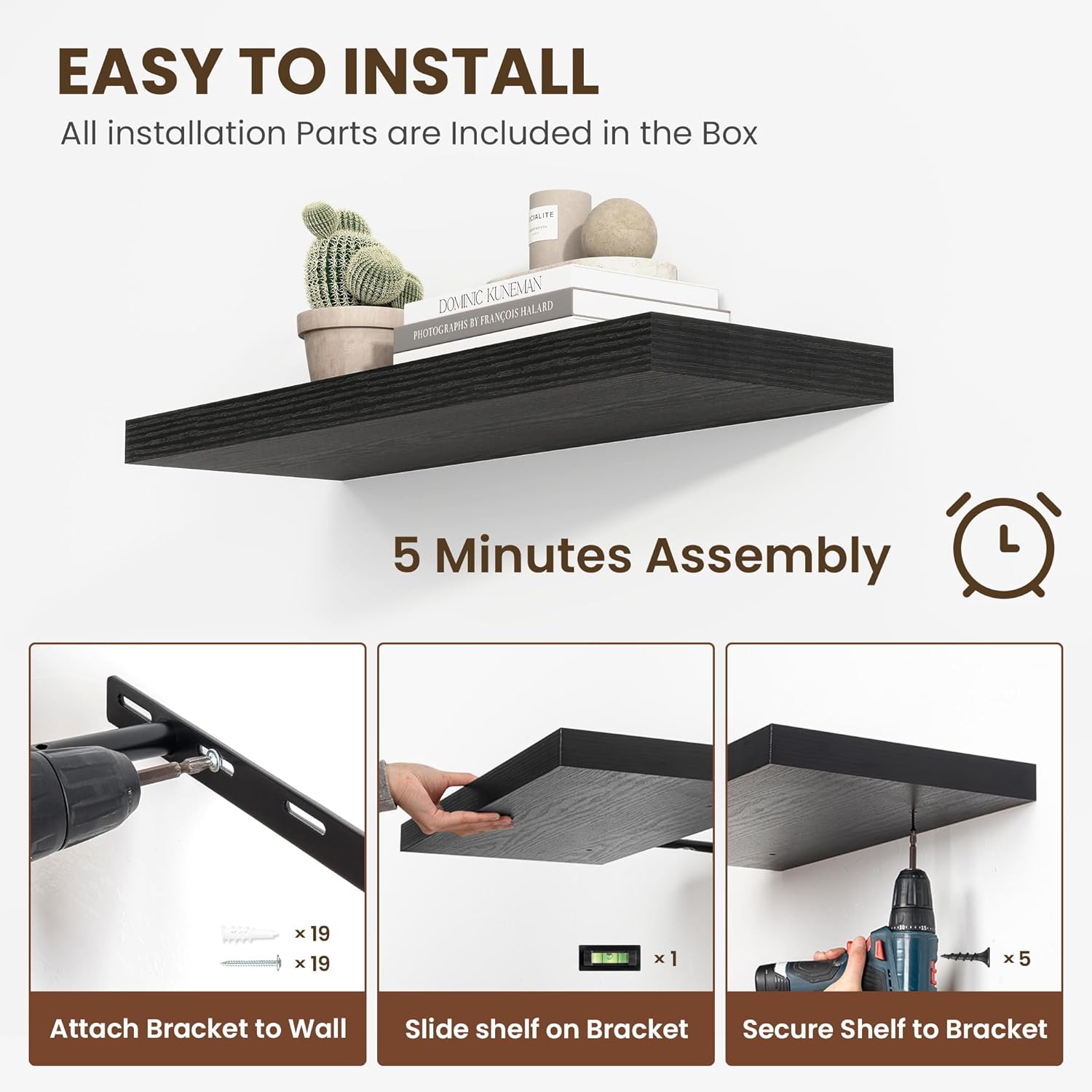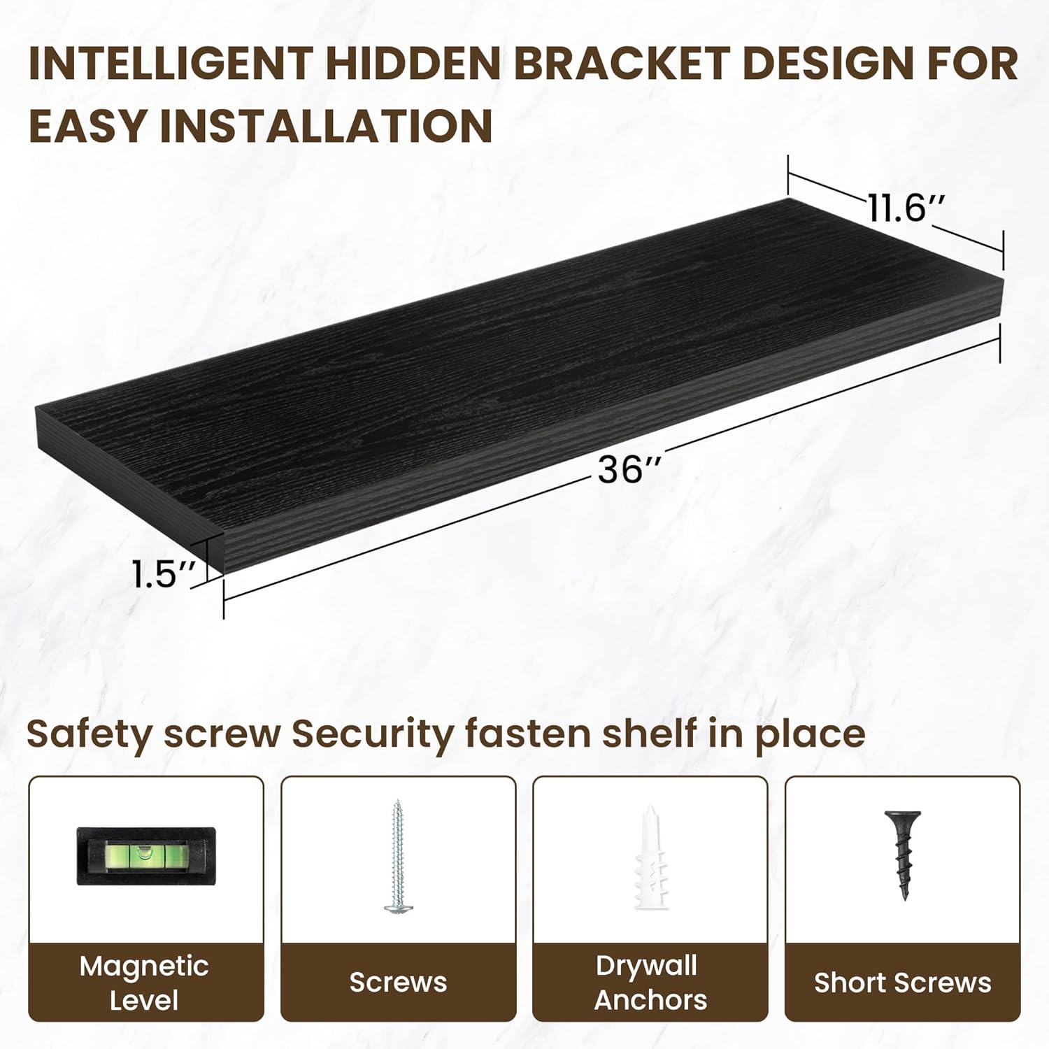 - ăEasy InstallationăDesigned with user convenience in mind, these shelves come with all necessary mounting hardware and clear instructions. You can have them up and ready to use in less than 5 minutes. Plus, our customer service is always ready to assist with any queries or concerns, ensuring a hassle-free experience