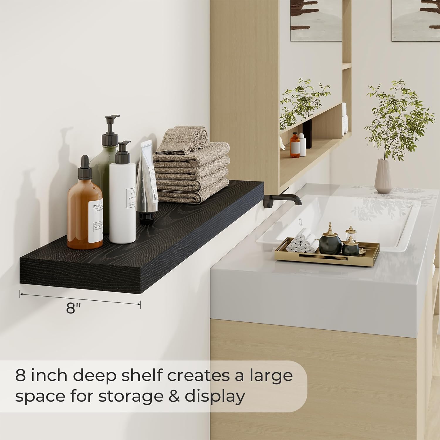 - With extra depth and thickness: This wall-mounted floating shelves measures 36"W x 7.9"D x 1.4"H, featuring an extra-deep and thickened design to maximize storage capacity and support up to 70 lbs. The large floating shelves robust construction allows you to safely display a variety of items, from books to décor. It helps reduce clutter and brings a sleek, modern touch to compact spaces, making it perfect for showcasing your favorite pieces without sacrificing functionality.