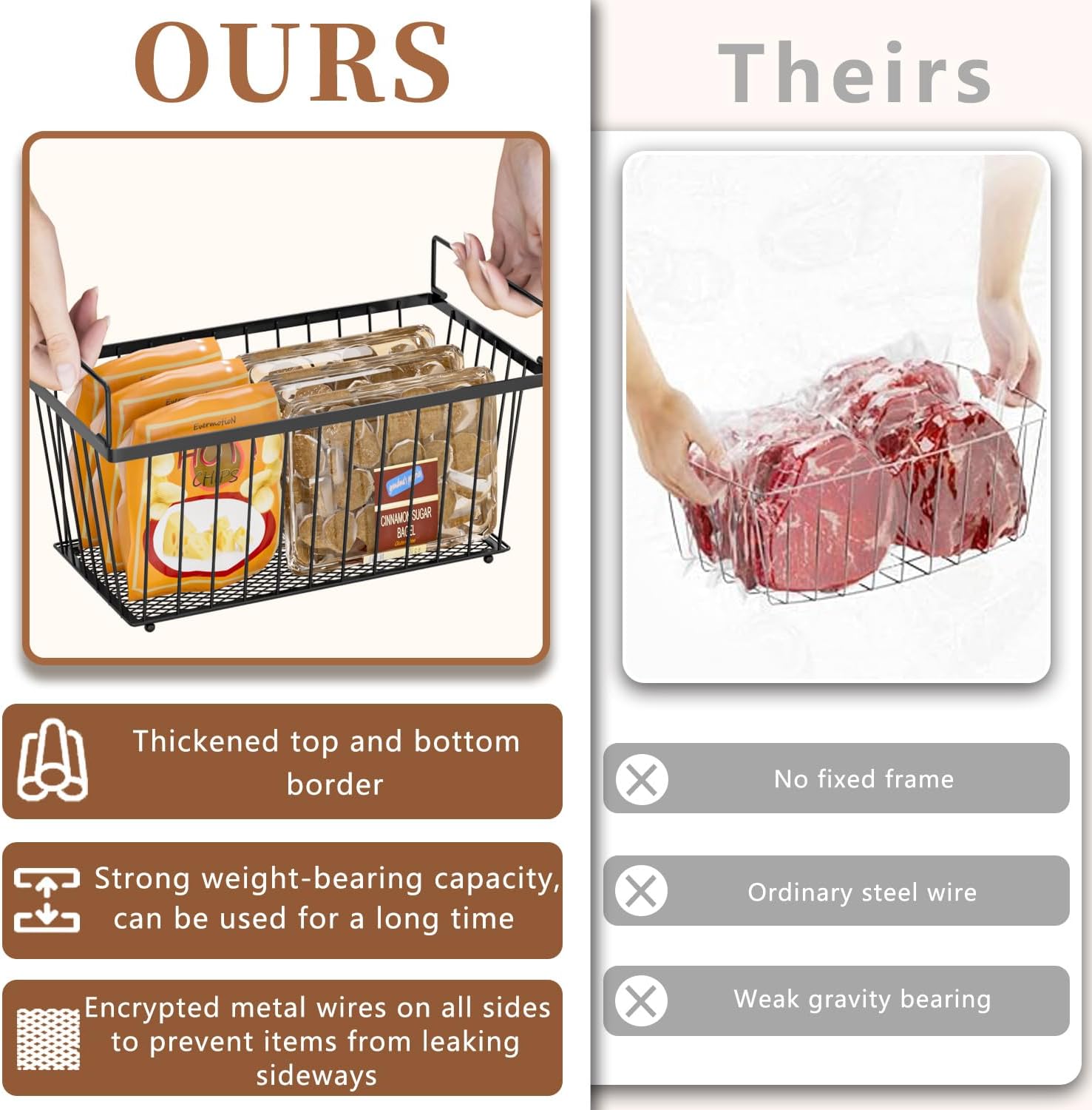 - Thickened Frame and Four-Sided Metal Mesh: Our chest freezer organizer bins are made of high-quality metal, with reinforced and thickened upper and lower frames and dense metal mesh design on all four sides, providing stronger load-bearing capacity and resistance to deformation. Therefore, this chest freezer organizer is more durable compared to regular models.
