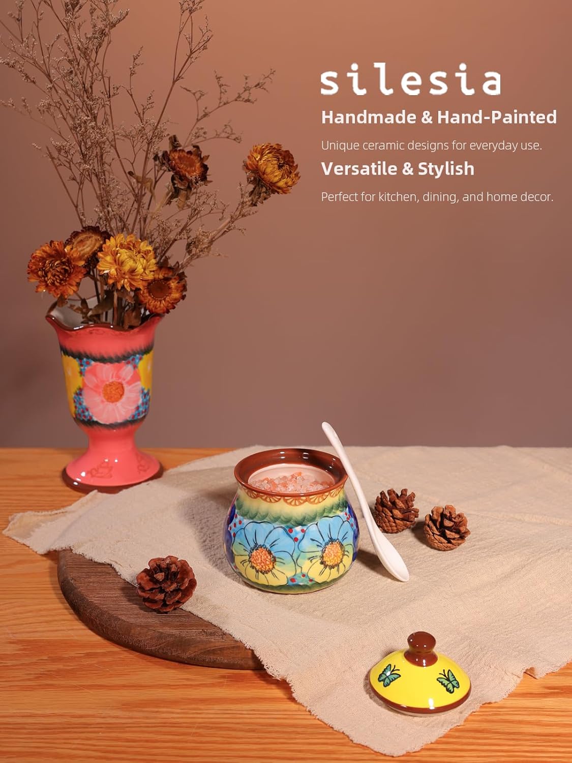 - Beautiful Hand-Painted Design: The sugar bowl features a unique, hand-painted design, showcasing vibrant colors and intricate patterns. This artisanal touch adds charm and character, making it a perfect decorative piece for your kitchen or dining table. Each piece is slightly different, reflecting the craftsmanship behind it