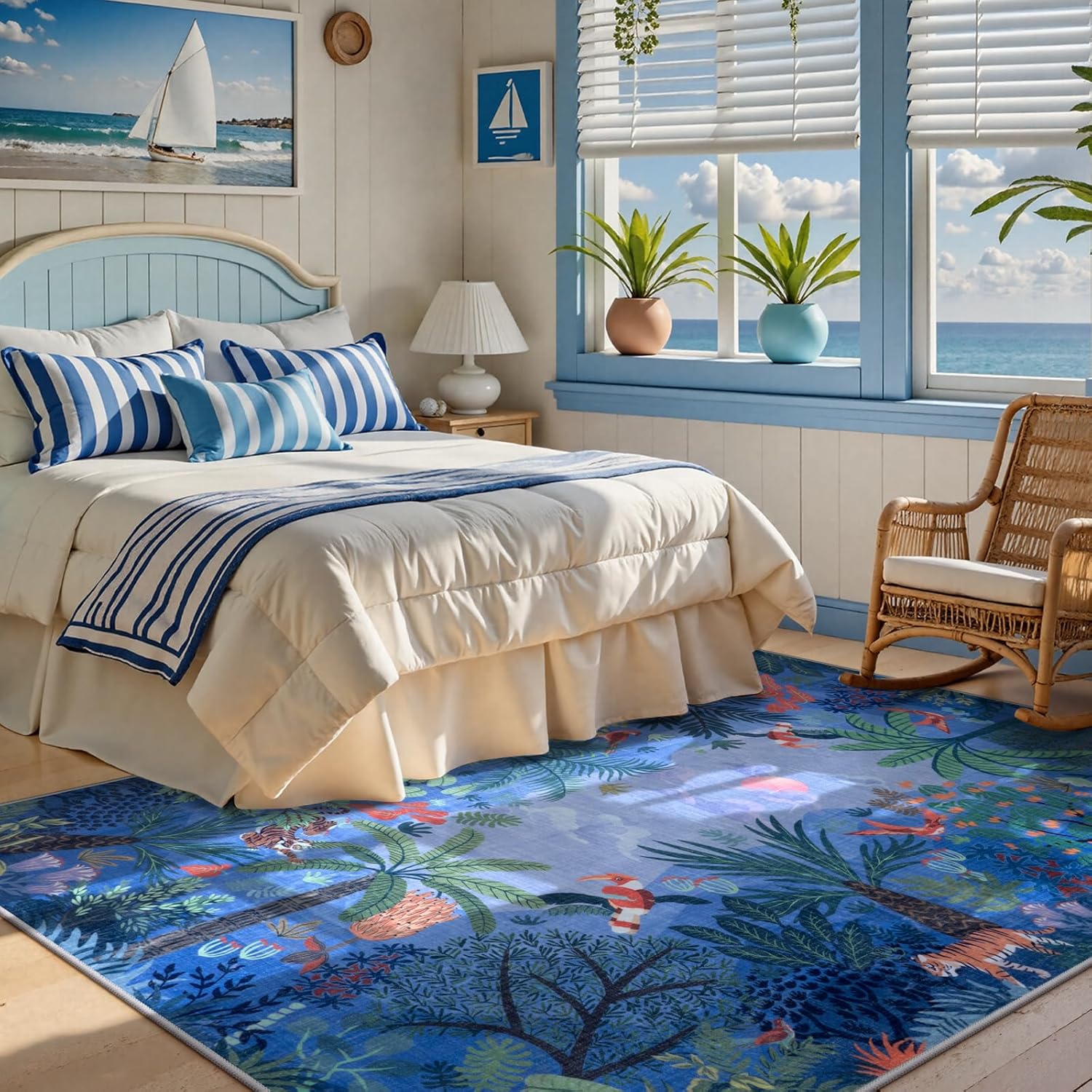LIVEBOX Washable Jungle Animal Print 5x7 Blue Rug for Living Room, Non-Slip Kids Bedroom Rugs for Boy Playroom Kid Baby Room, Soft Stain Resistant Blue and Green Rug for Nursery Boy Dining