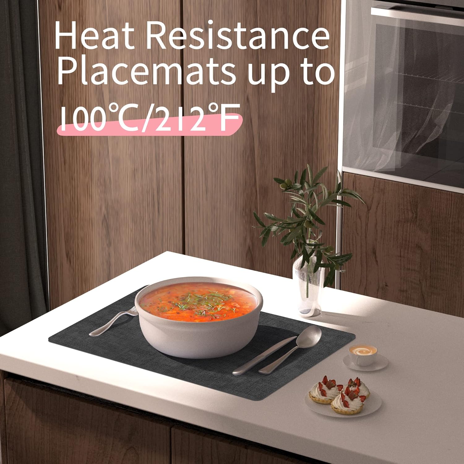 - HEAT RESISTANCE - UP TO 212 °F (100 °C): These quality dining table place mats are with 2mm thickness to protect your dining table from white heat marks. Each is sealed with a durable coating that is both stain and heat resistant to 212 °F.