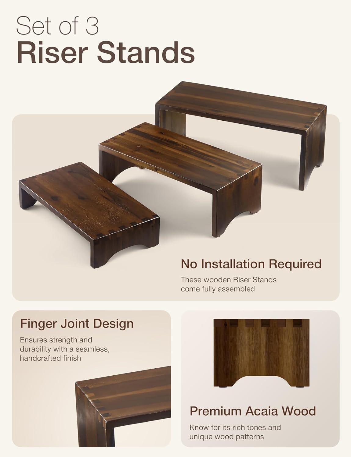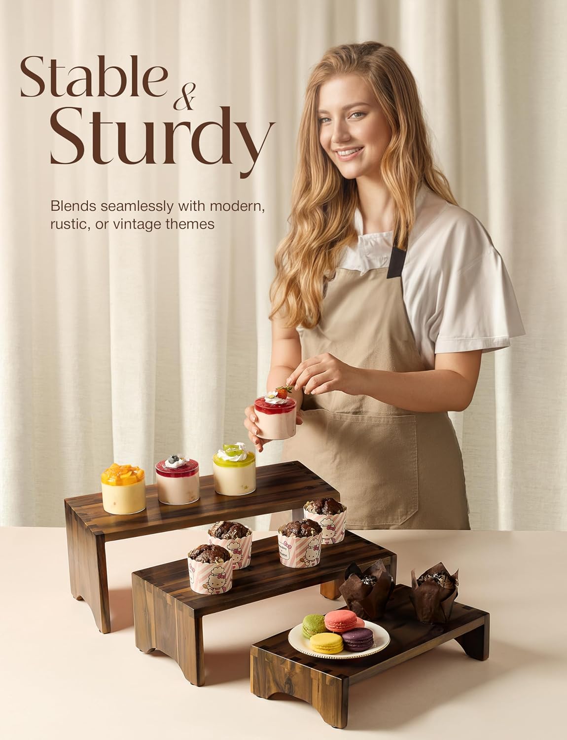 - Set of 3 Sizes: This wood risers display stands set include three different size 16.5", 15", and 13.4" in length. These food risers for buffet table can be used individually or nested together, offering flexible height options for tiered dessert presentation, countertop organization or buffet risers and stands