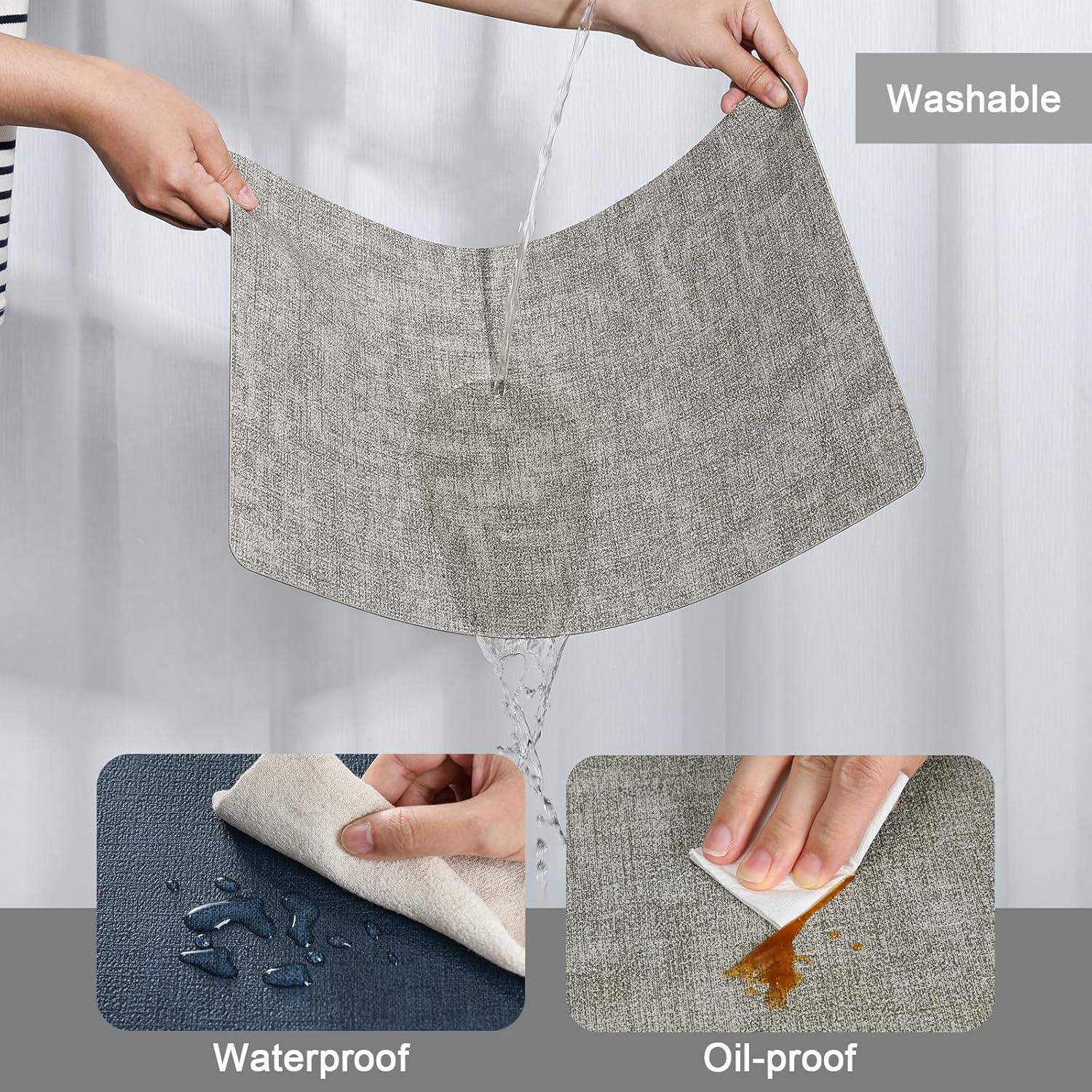 - These placemats are made of faux leather, the sufface texture imitate the linen. Unlike woven or fabric placemats, these placemats are water resistant, they can block the sauce or any liquids to protect the desktop.