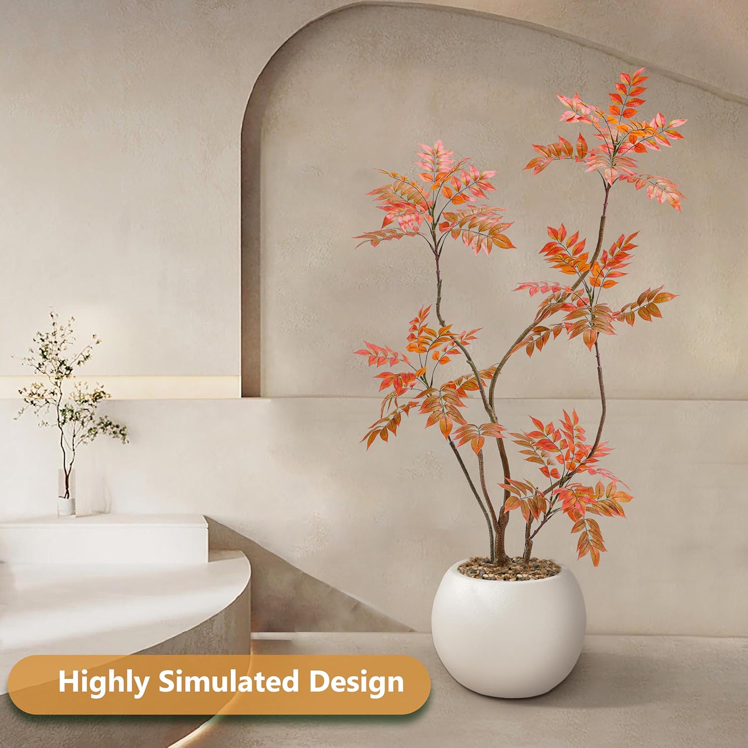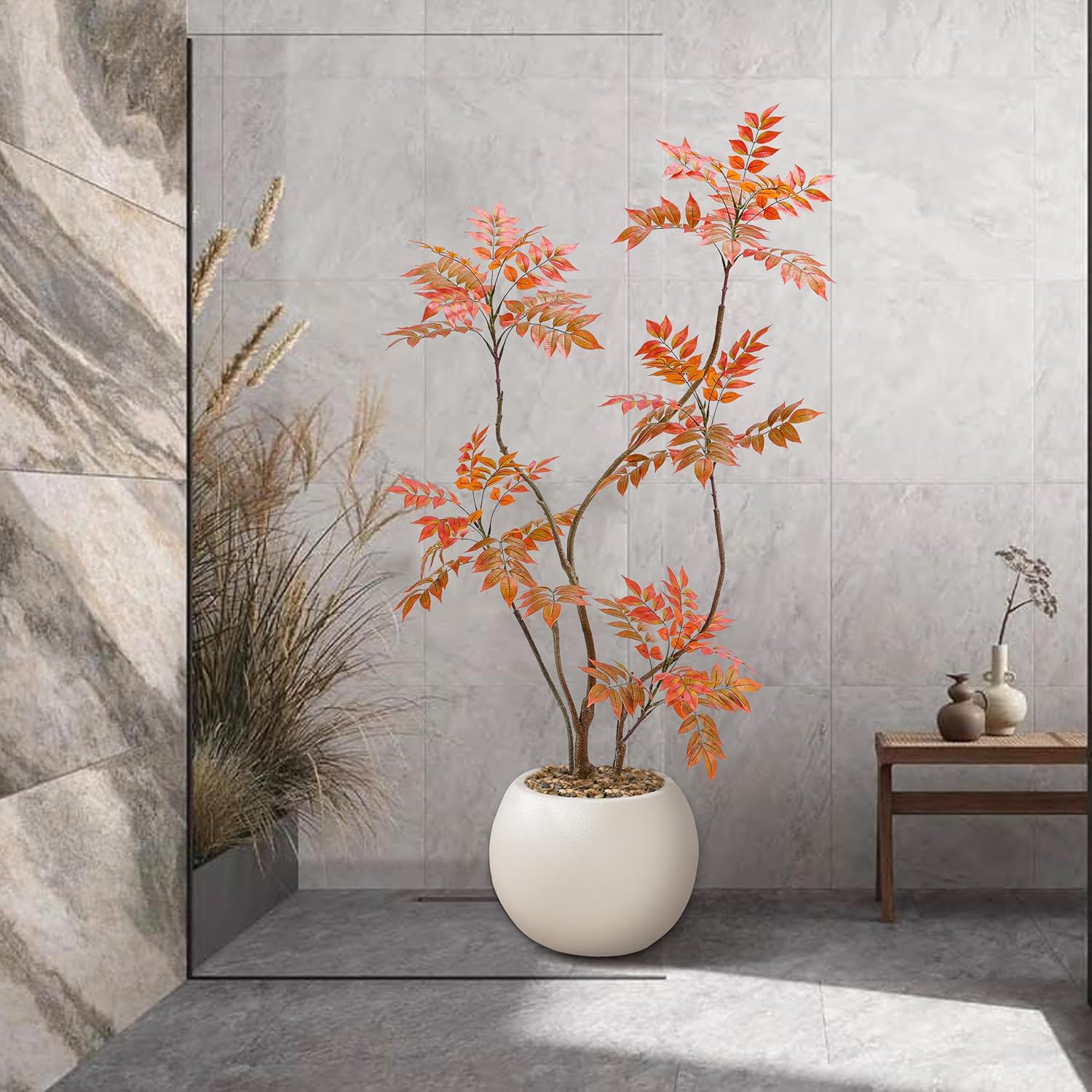 • Home Decor Accents: This 5ft/60in tall faux sumac tree contains 500 pieces real touch leaves who made of silk and each leaf has veins on it. Inclus a white planter(10"H x 10"W). The interior of the planter is made of sturdy concrete and the surface is decorated with non-falling coloured pebbles and the base use anti-tip tilt protection for greater stability