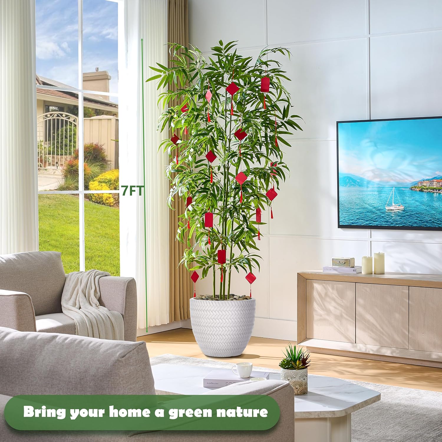 • Ultra-Realistic Indoor Artificial Tree: This 7ft/80in tall artificial bamboo plant has 4 smooth pristine trunks connected with arching bamboo leaves with realistic texture. Inclus a white planter(7"H x 7"W). The interior of the planter is made of sturdy cement and the surface is decorated with non-falling coloured pebbles and the base use anti-tip tilt protection for greater stability