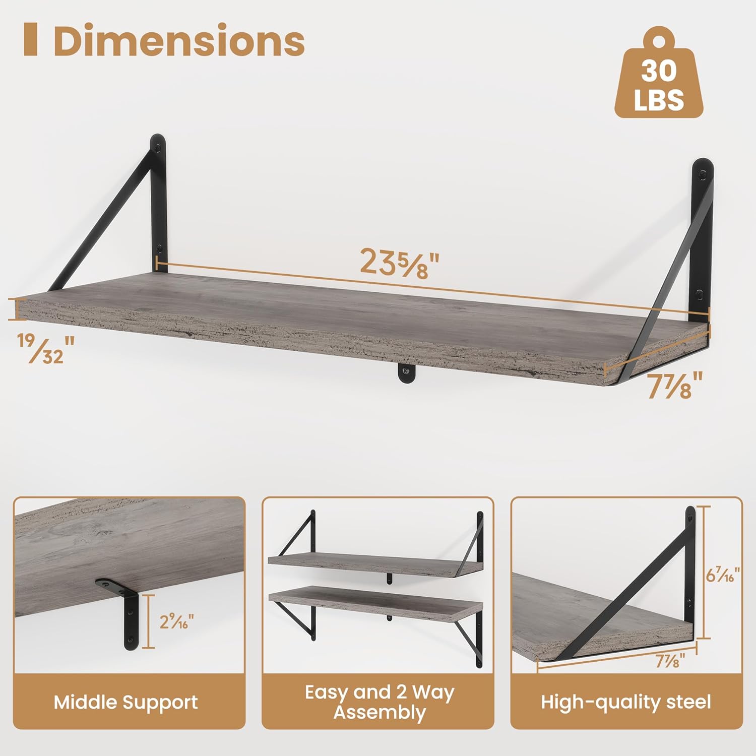 - ăSturdy and DurableăThe wall-mounted shelves are sturdy enough,with a load-bearing metal frame added in the middle,which will not deform and can withstand a weight of 30 pounds. It is very suitable for use as a wide bookshelf,TV stand,for home office,laundry room. Follow the instruction steps,including all necessary hardware,easy to assemble.