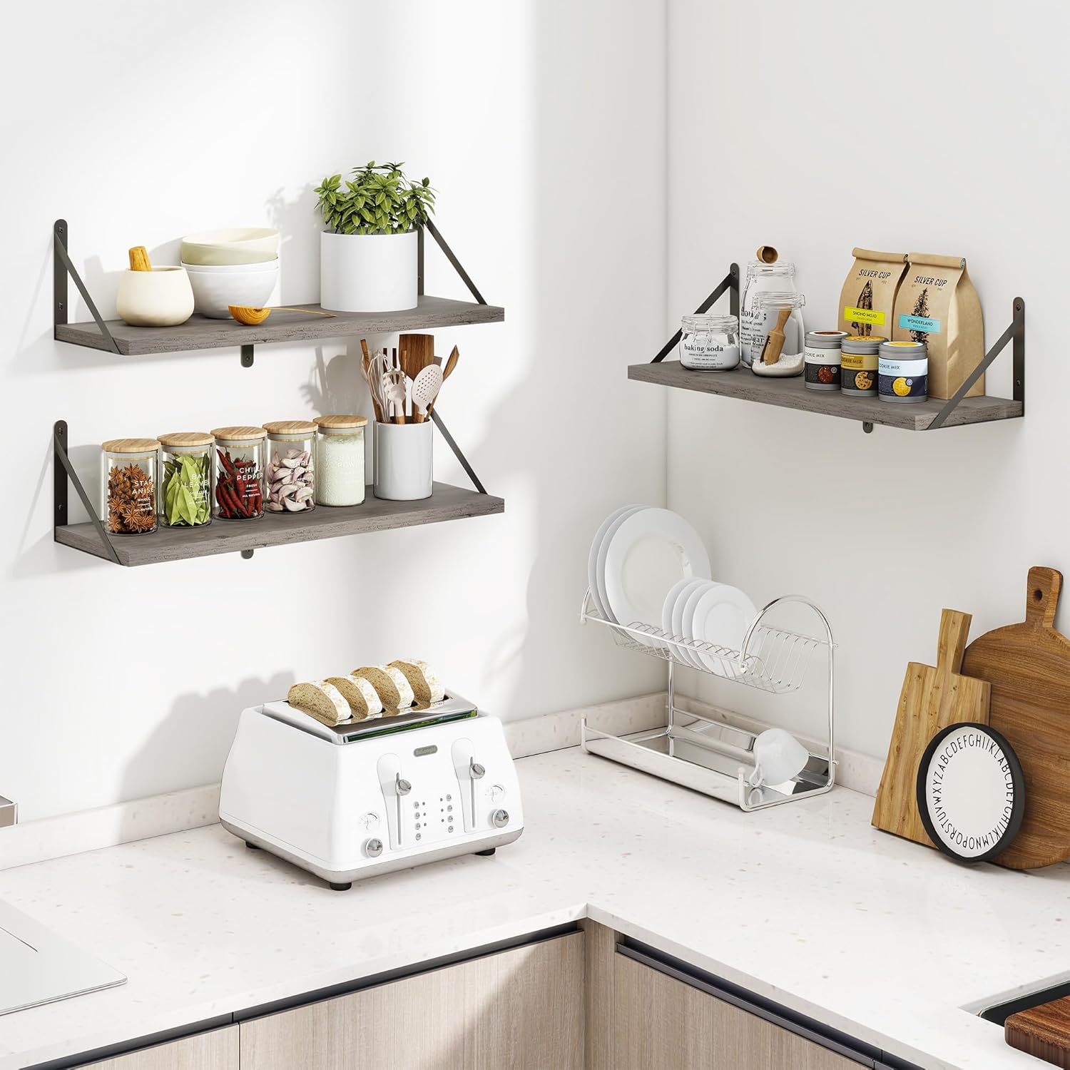 Heimlove Floating Shelves for Wall 24 Inches,8 Inches Deep Wall Bookshelf Mounted Display&Storage Wood Shelves for Kitchen Bathroom Laundry Living Room,Set of 3 (Silver Grey)
