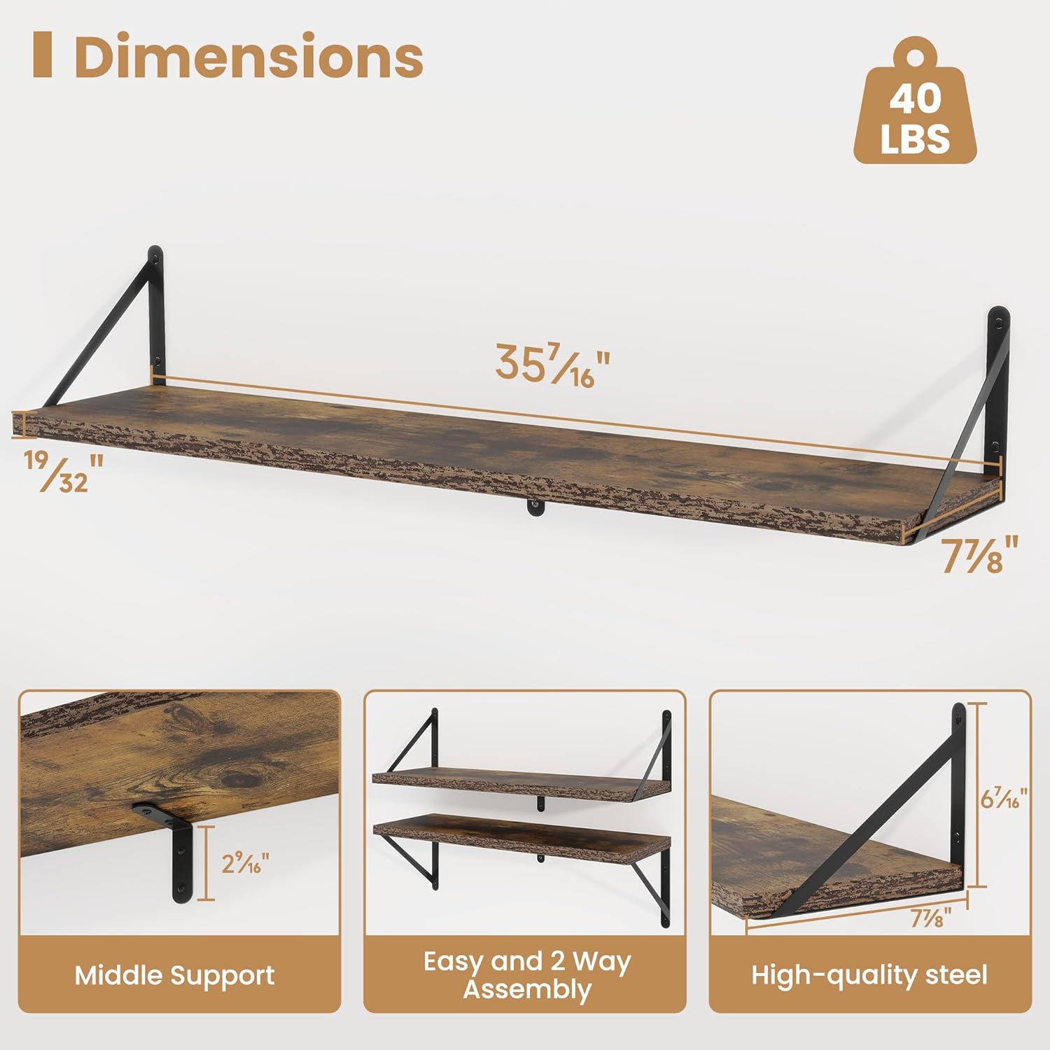 - ăSturdy and DurableăThe wall-mounted shelves are sturdy enough,with a load-bearing metal frame added in the middle,which will not deform and can withstand a weight of 40 pounds. It is very suitable for use as a wide bookshelf,TV stand,for home office,laundry room. Follow the instruction steps,including all necessary hardware,easy to assemble.