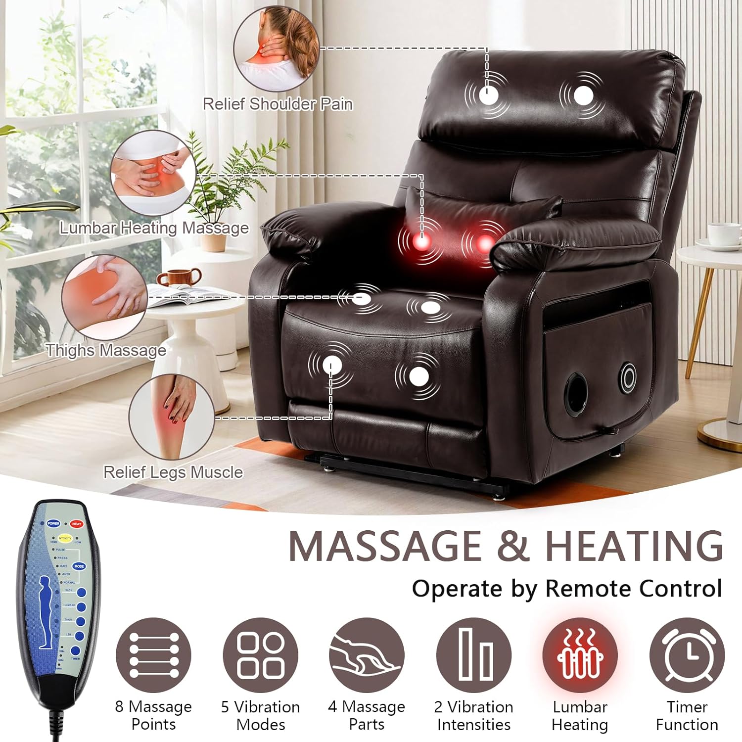 - ăMassage & Lumbar HeatingăEight massage points are distributed across the back, waist, thighs, and legs, with five massage modes and adjustable vibration intensity for a fully customizable experience. The lumbar heating function improves circulation and relieves waist pressure, making it perfect for anyone looking for a heated lift chair or massage recliner chair