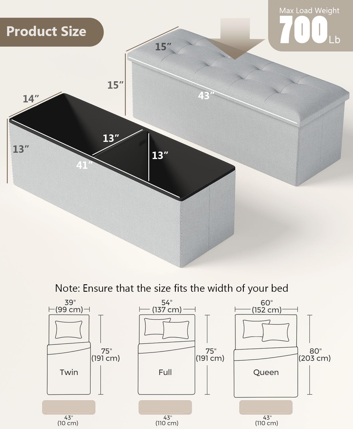 - [Plenty of Storage Space] This folding ottoman Foot Rest, sized 15”D x 43"W x 15”H (38 x 110 x 38 cm) with a total capacity of 35 gallons, can be used to neatly organize your bed sheets, blankets, magazines, and more