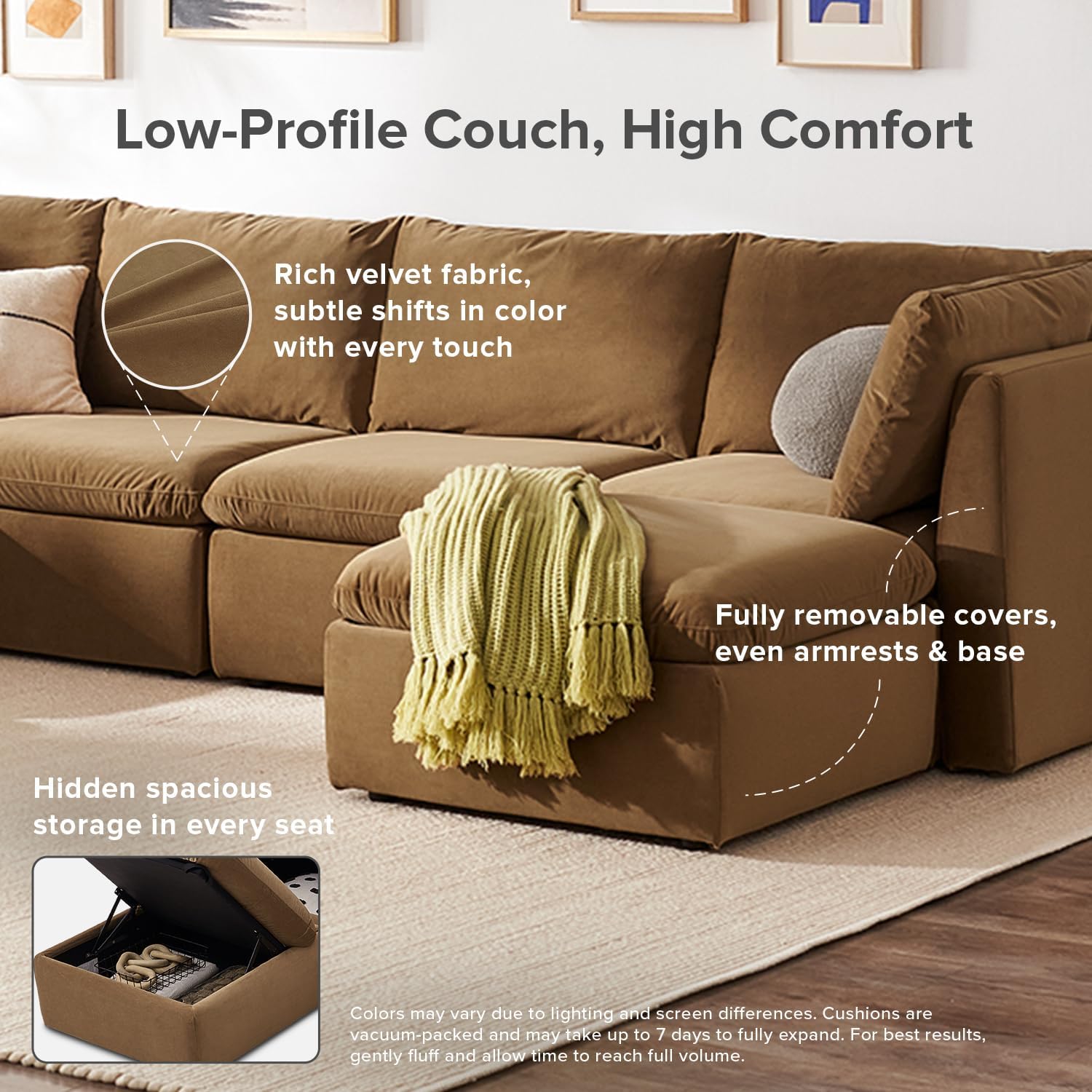 - Disclaimers: Colors may vary due to lighting and screen differences. Cushions are vacuum-packed and may take up to 7 days to fully expand. For best results, gently fluff and allow time to reach full volume. Measurements may differ by up to 5% due to upholstery puffiness. Ships in multiple boxes, which may arrive separately